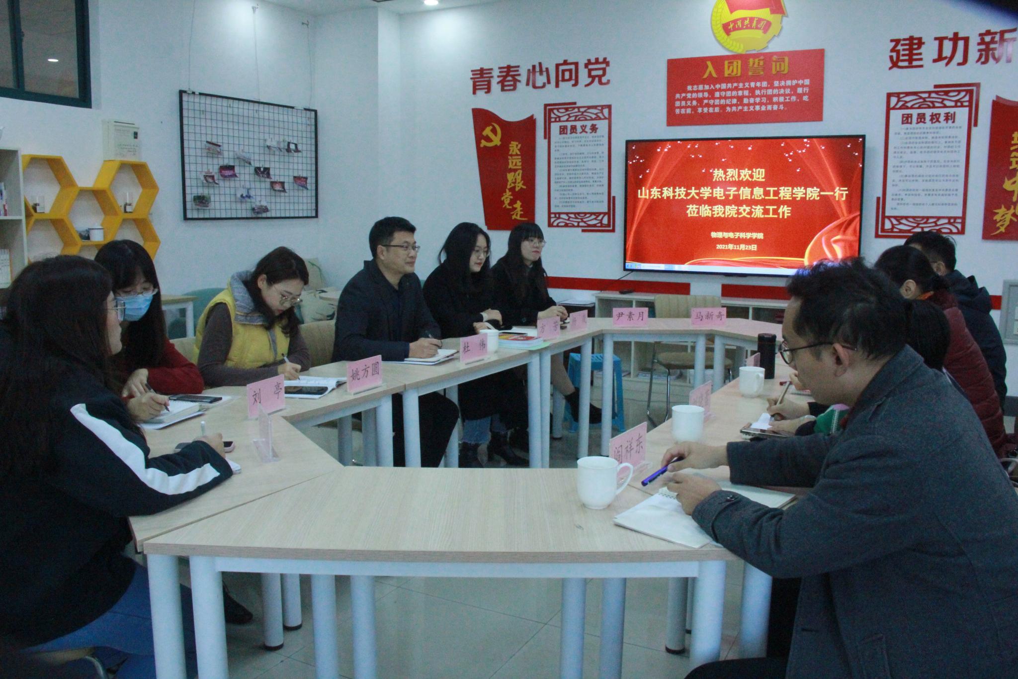 11月23日,山东科技大学电子信息工程学院党委副书记陈冰一行四人到我院交流考察。校长办公室副主任郑克刚,学院党委书记谢德仁对来访客人表示热烈欢迎。物电学院党委副书记杜伟与各级辅导员参加了交流活动。