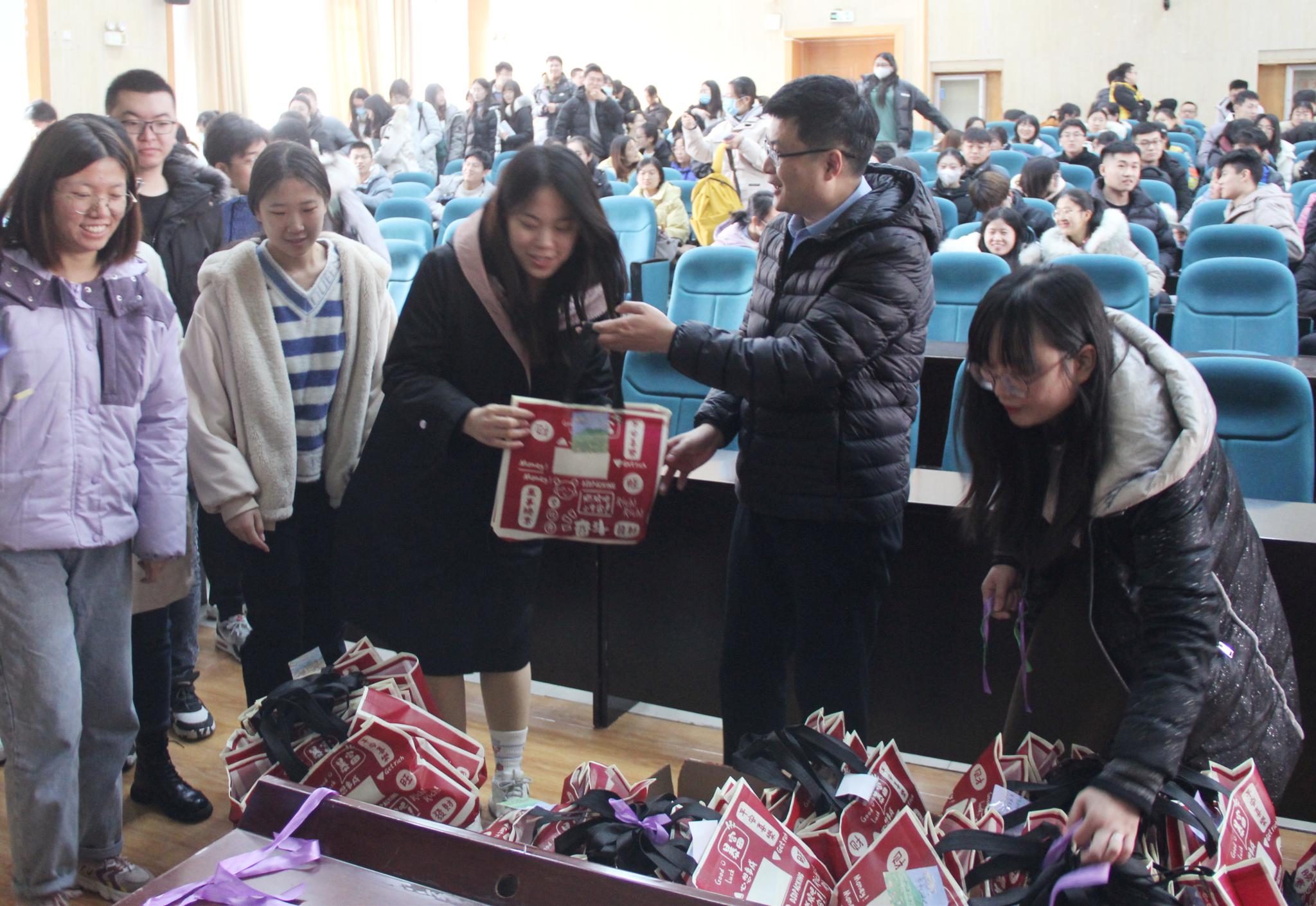大会伊始,杨岚向考研学子就证件问题进行着重强调。接着,她谈到由于疫情形势的特殊性,学生需按照规定要求做好防疫措施,保护好人身安全。同时,在临近考试期间,学子们要注意饮食营养,保持身体健康。18级辅导员方芳虽未出席本次大会,但她以视频形式和17级师哥师姐们一起为考研学子们送上了衷心的祝福。随后,杜伟为考研学子加油打气、鼓励动员,并就考生心态问题进行细致阐述。他指出,考生在备考期间不仅需要强化知识储备,更迫切需要调整好心理状态。良好的心理暗示,有助于考生们在现场的发挥。最后,杨岚和杜伟亲手为学子们送上由老师们精心挑选的礼包。礼包中装着物电学院为大家贴心准备的芝士条、百事可乐、旺仔牛奶等礼物,寓意着知识满满、心想事成、万事如意。每一份递交到考研学子手中的礼包都饱含着学院全体老师对大家殷切希望和家人般的温暖关怀。收到礼包的学子们纷纷表示,自己一定会牢记老师的谆谆教诲,抖擞精神,考出佳绩。本次大会在考研学子们的热烈掌声中落下帷幕。