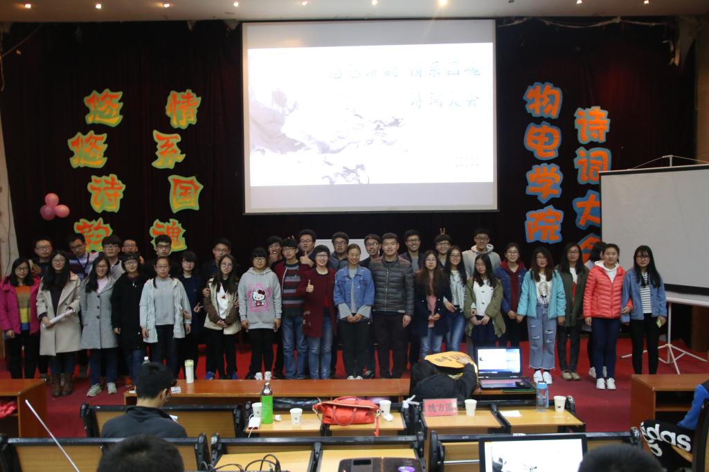本次诗词大会设置诗词接龙、常识选择、诗词九宫格和飞花令五个环节。在2015级电子科学与技术班张晓蕾的一曲《江南》歌声中,诗词大会拉开帷幕。在诗词接龙环节,留云借月队的陈德伟熟背《长恨歌》,成功对出“上穷碧落下黄泉,两处茫茫皆不见”,现场掌声不断;逐梦诗华队的翟宇飞不负众望,答对八道题,其诗词储备量令观众连连称赞。本轮比赛结束后,学院喜剧大咖尤洪浩带来的相声《打油诗》回味无穷。经过第一轮的激烈比拼,指点江山队等六支队伍成功晋级接下来的四轮比赛。在常识选择环节中,逐梦诗华队的宋玉鑫凭借丰厚的文化底蕴答对所有题目,现场欢呼声四起;诗词九宫格比赛中,2016级免费师范生班的周响响连续答出“当春乃发生”“四海无闲田”和“春来发几枝”,为逐梦诗华队再次注入活力,以“春城无处不开花”而出名的飞花令将此次诗词比拼推入高潮,指点江山队燕雪洁和腹有诗书队的袁倩对答“月”字,精彩纷呈,现场观众为两人的出色表现赞叹不已。激烈的比拼结束后,学院十大歌手牛康迪带来一曲《牵丝线》,使评委、嘉宾及观众在美妙的旋律中共同品味诗词古韵之美。之后,王东磊引用杜秋娘《金缕衣》中的名句“劝君莫惜金缕衣,劝君惜取少年时”告诫大家学习须趁大好青春年华。激烈的比拼结束,最终“我爱记诗词队”“腹有诗书队”和“且听风吟队”获得诗词大会三等奖,“留云借月队”和“指点江山队”获二等奖,“逐梦诗华队”荣获一等奖。