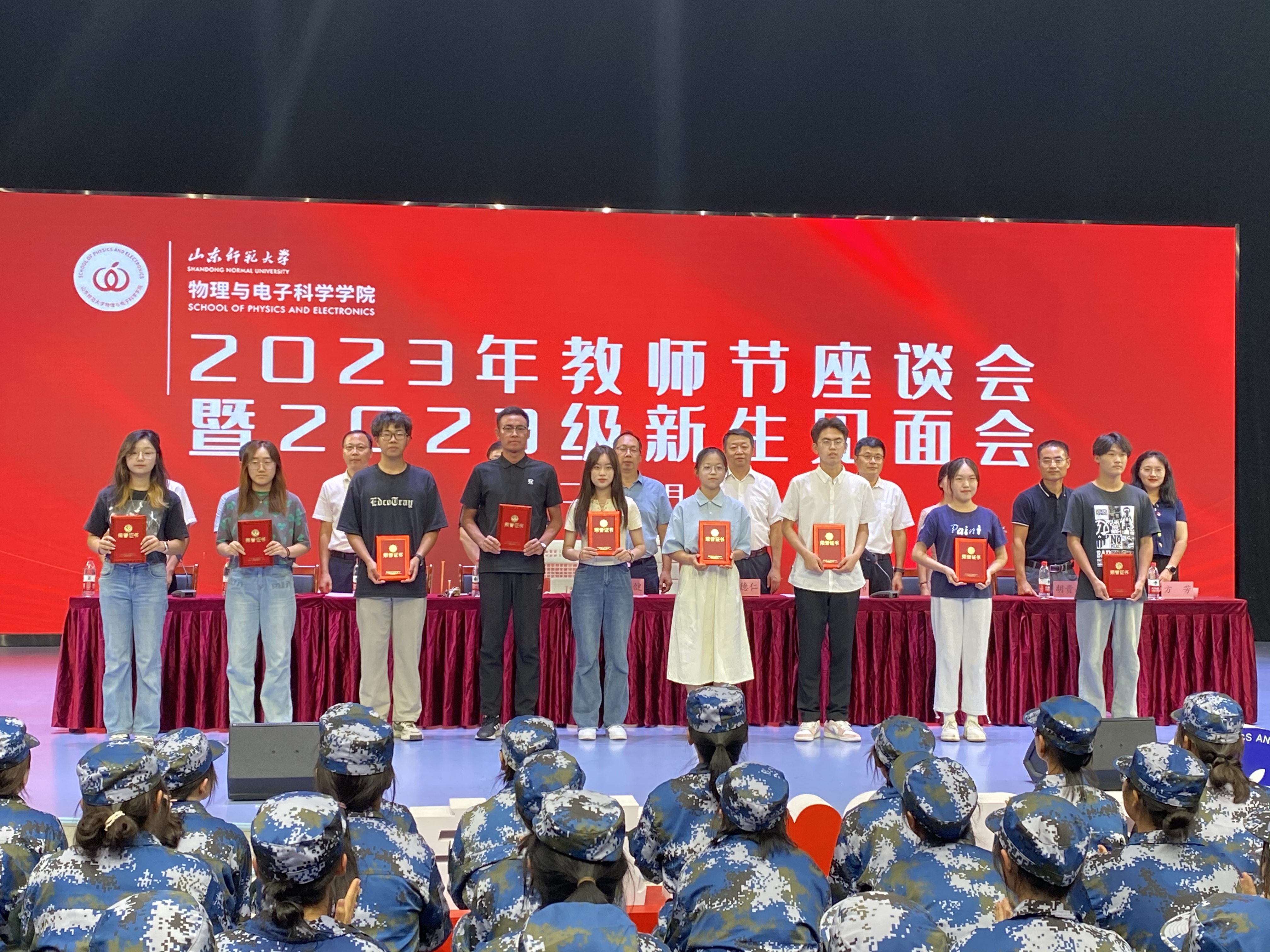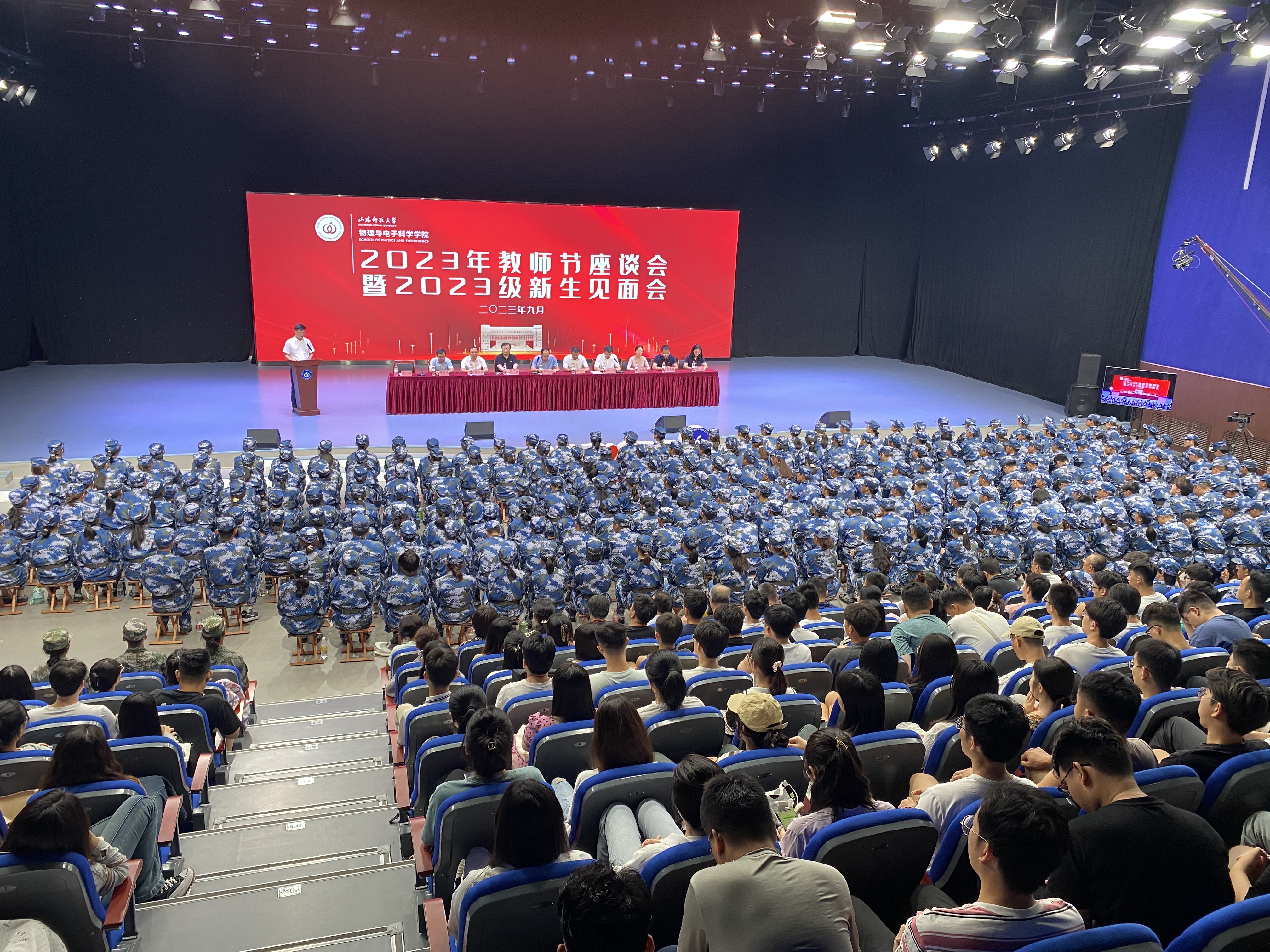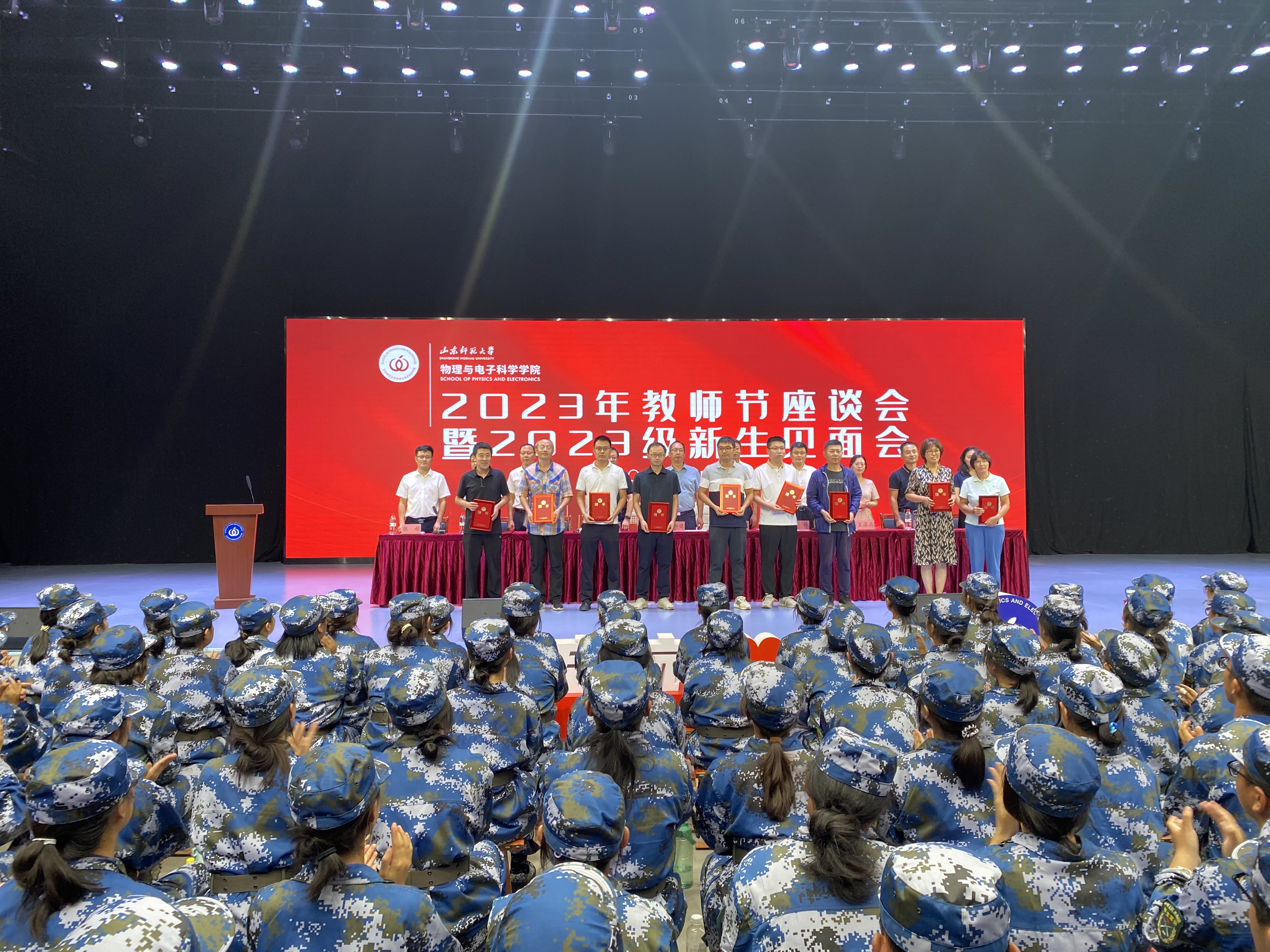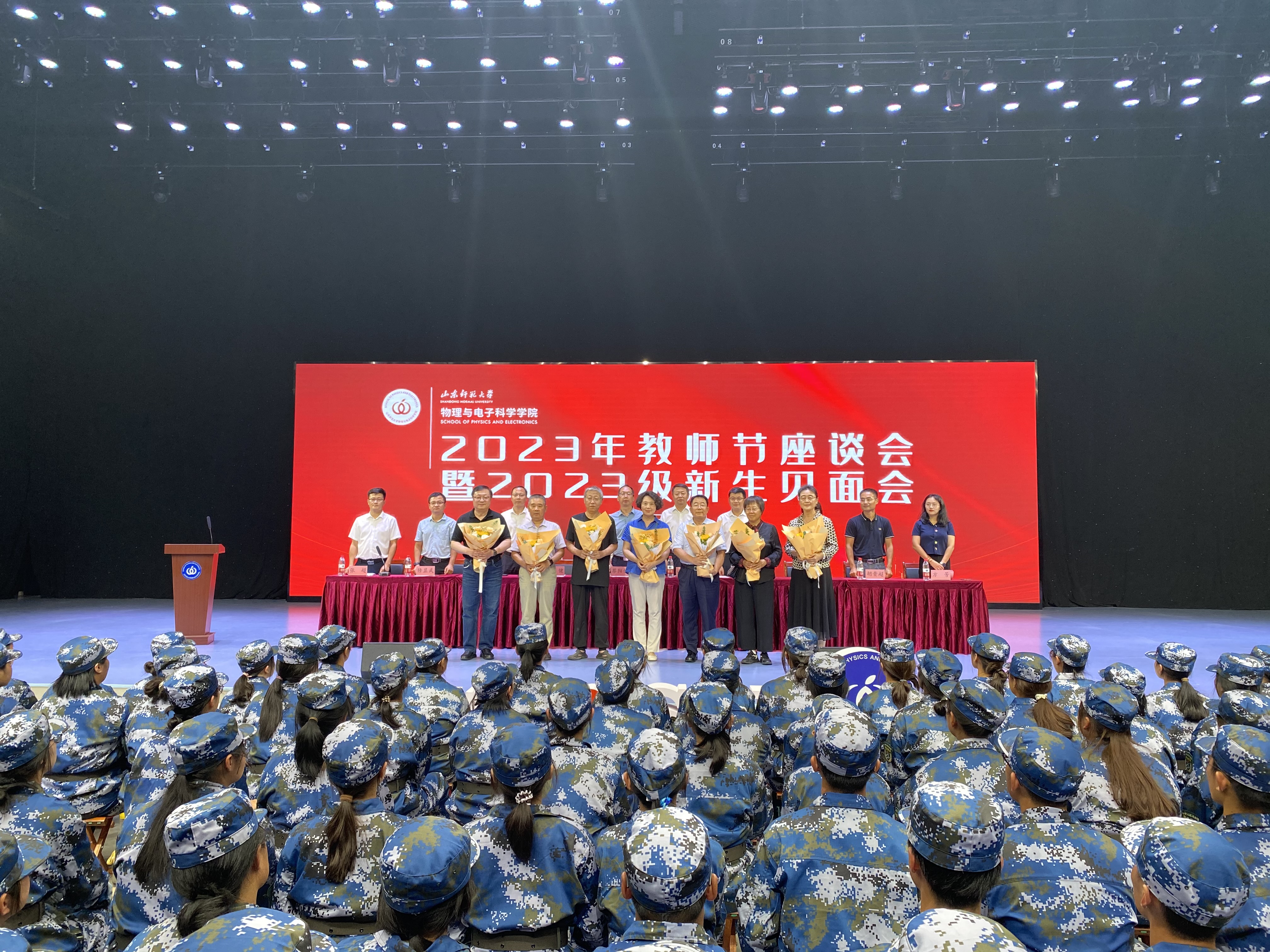 9月8日下午,英国365上市公司于文浚楼150室举行2023年教师节座谈会暨2023级新生见面会。365上市公司副校长、学院院长蔡阳健,院党委书记谢德仁,副院长宋玉志,副院长、电子系主任王晶晶,工会主席修显武,物理系主任胡贵超,退休教师代表李健,青年教师代表张超,学工办主任、团委书记方芳出席见面会,2023级新生辅导员于双阳、张雨辰,全体本科生、研究生新生参加。见面会由党委副书记杜伟主持。