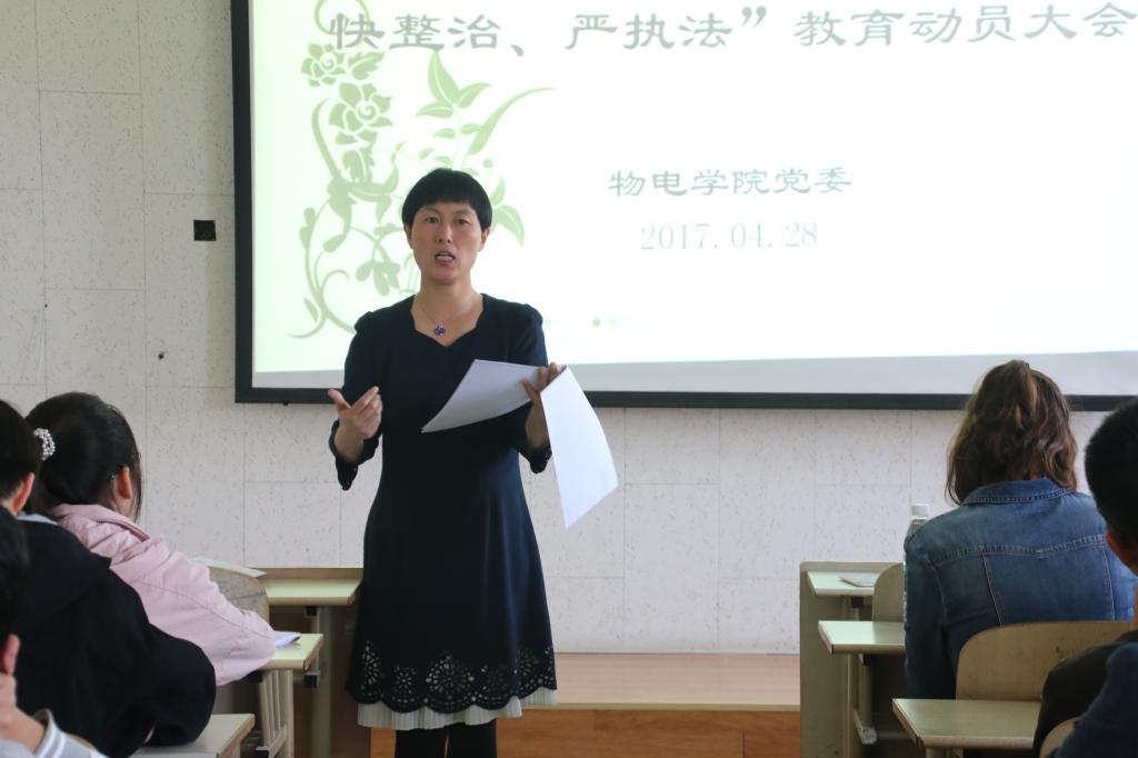 会上,万金凤首先对研究生与本科生在本学期上半阶段取得的成绩表示肯定。她强调:“学院近期在学术竞赛、先进评选、文体活动等各方面取得的成果离不开同学们的辛勤付出与努力,希望大家保持积极态度,争取再创佳绩。”随后,胡桂香发表了题为《走向文明》的讲话。她指出,大学生作为高素质群体,是未来社会文明的标志。“文明是一种氛围,氛围需要每个人用心打造。学生干部作为学生工作的组织者与实施者,应努力带领同学们营造安全、舒适的生活环境,从而提升个人修养。”接下来,万金凤向与会学生干部宣读了由山东省人民政府安全生产委员会发布的《关于印发2017年全省夏季消防检查工作实施方案的通知》(鲁安发【2017】14号)及《中共山东省委高校工委关于组织开展校园安全隐患“大排查、快整治、严执法”集中检查的通知》(鲁高工委通字【2017】24号)。万金凤就文件中的相关条例作出解读,并对相关自查工作进行部署。
