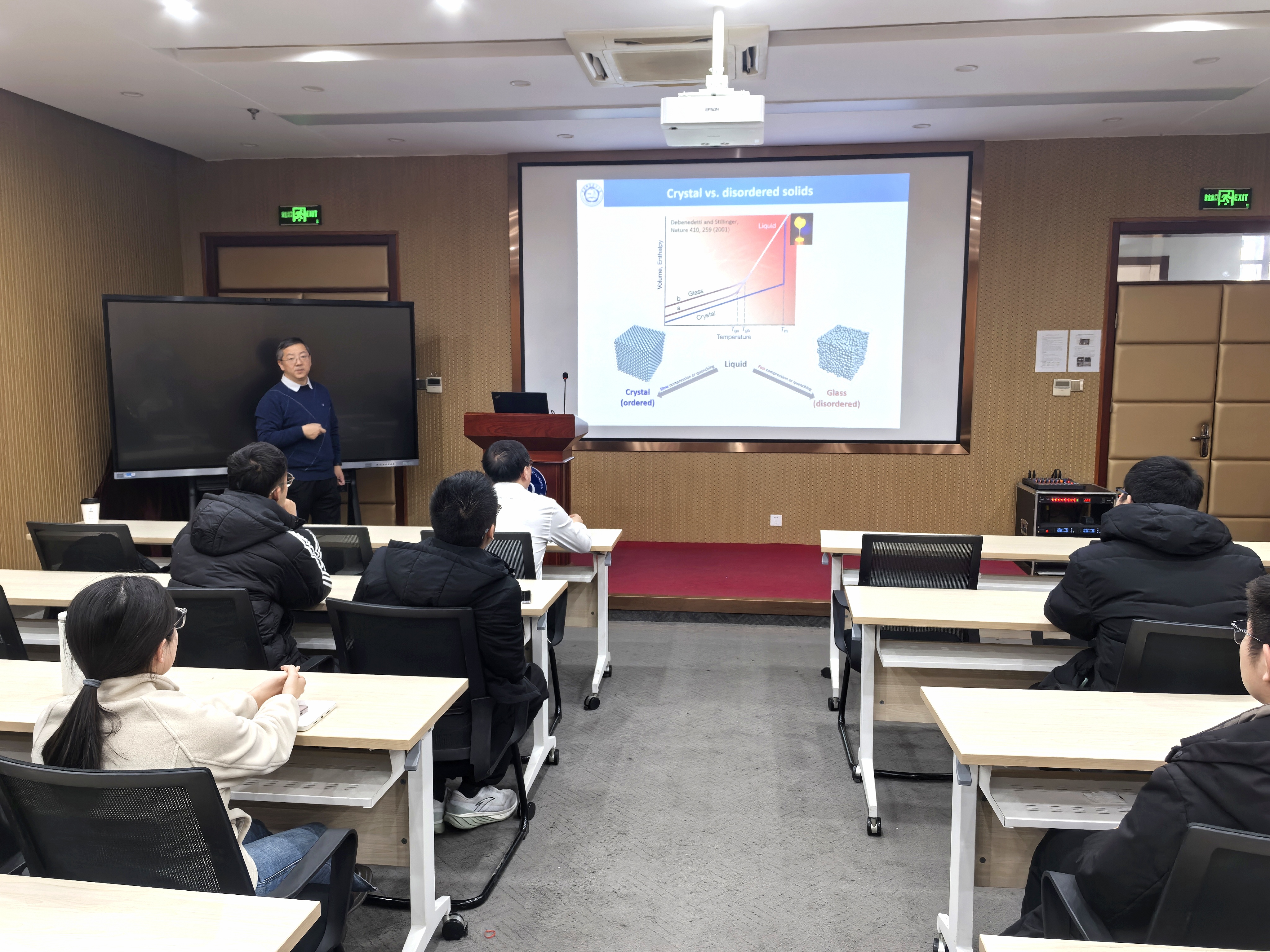 徐宁教授作题为《非晶固体的稳定性》的学术报告。他首先介绍了非晶固体在外加压力、剪切、自驱动等负载情况下会呈现弹塑性形变响应,塑性形变源于非晶固体的失稳,会造成固体不可逆的结构重组和材料的毁损;阐述了由于非晶固体结构无序、处处是缺陷,晶体的断裂往往由缺陷触发,因此探索其负载不稳定的形成机理、预言触发塑性形变的关键区域极具科学挑战性。随后,徐宁教授详细介绍了他们团队通过对非晶固体结构和本征振动特性的表征,给出了决定非晶固体稳定性的关键因素,从本征振动特性的角度建立了非晶固体稳定性的物理图像,发现了两类不同的负载不稳定性,并且揭示了它们各自的形成机理。报告结束后,徐宁教授与现场师生进行了交流互动,对师生提出的问题进行了耐心详细的解答,深化了此次学术交流的广度与深度。报告受到师生热烈欢迎。
