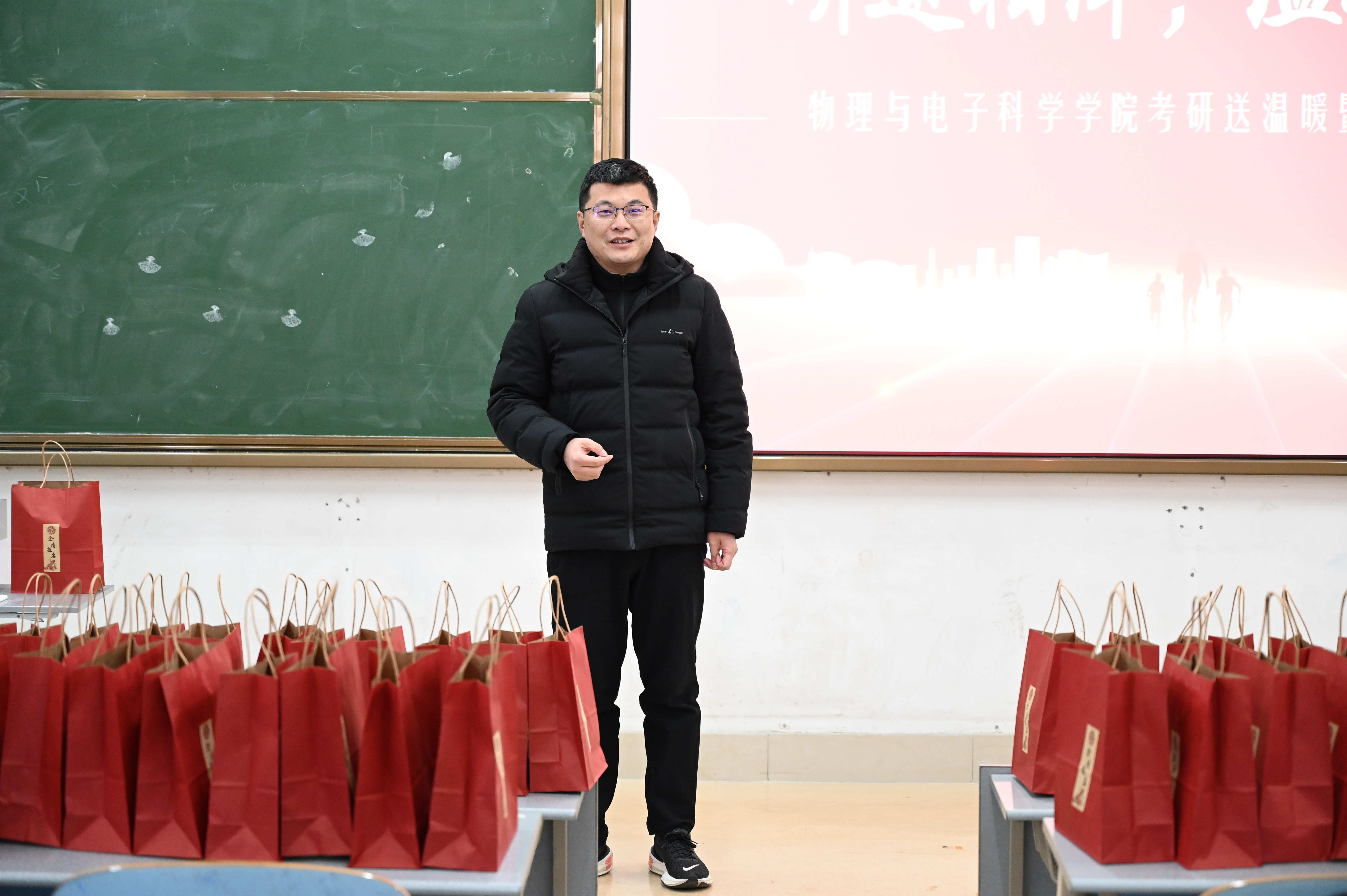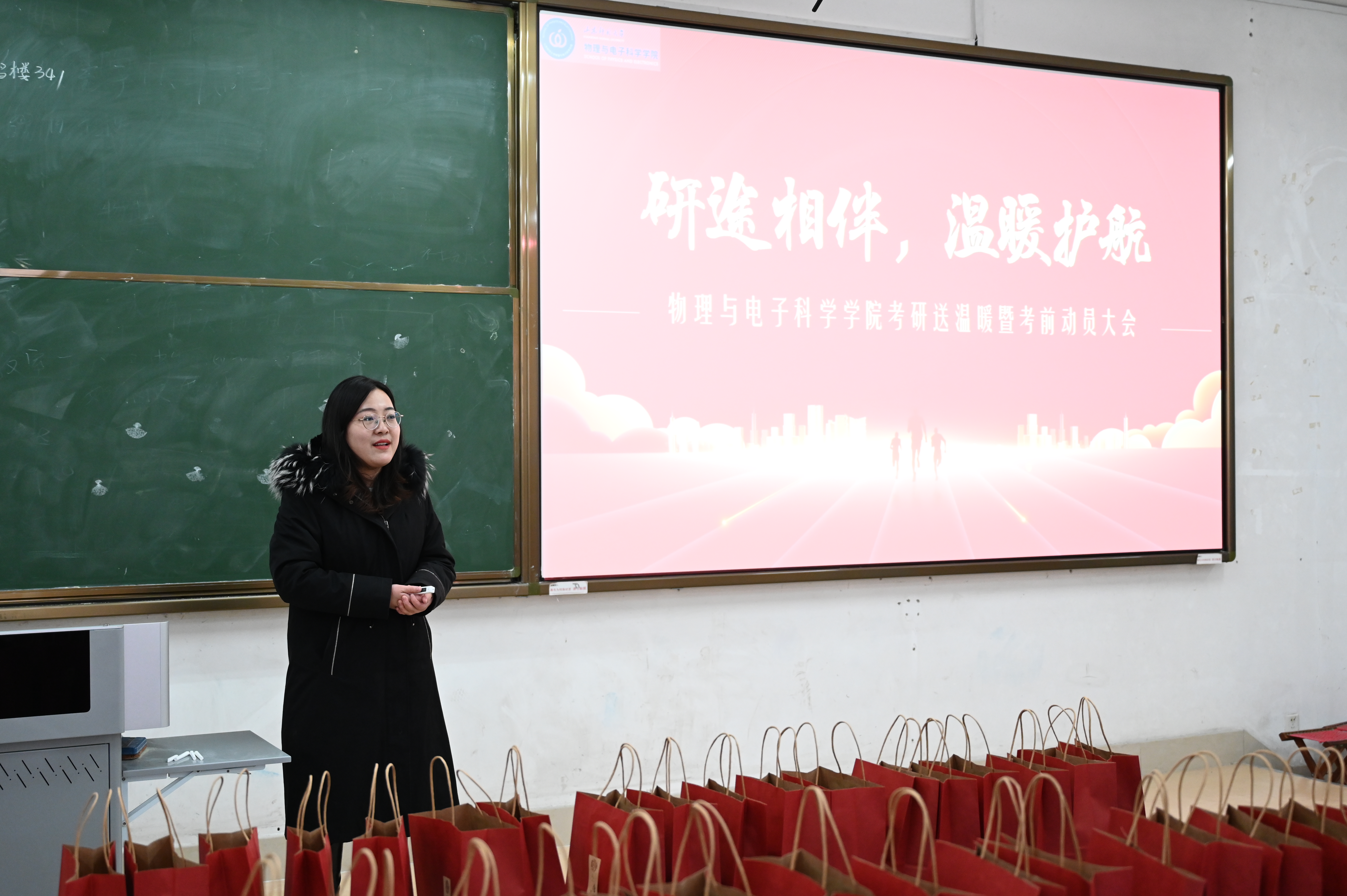 12月18日,英国365上市公司于文渊楼C131室举行“‘研’途相伴,温暖护航”2025届考研慰问暨考前动员会。学院党委副书记杜伟,学院学工办主任、团委书记方芳,毕业班辅导员杨岚、尹素月共同为百余名考研学子们发放“考研大礼包”,并送上温暖祝福和鼓励。