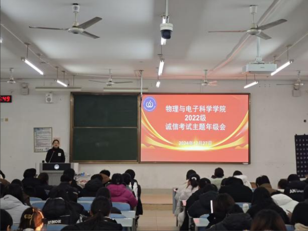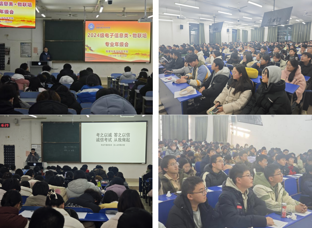 12月26日,2024级本科生辅导员苏恒召开2024级本科生诚信考试动员会。学院电子系主任宋蓬勃出席并发表讲话,全体2024级本科生参加。宋蓬勃向同学们说明了违纪情节将导致的严重后果,引导学生进一步端正考试态度、强化诚信观念,以周全的考试准备、健康的考试心态、优良的考试作风迎接期末考试的到来。苏恒鼓励学生干部做好模范带头作用,做好复习规划,带领同学们一起学习,共同进步,并预祝同学们在考试中获得佳绩。