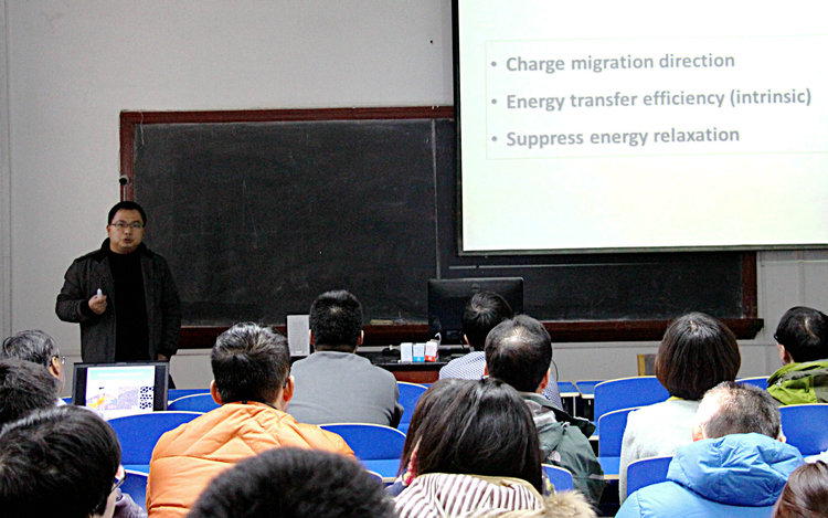 江俊教授主要从事理论与计算化学的研究工作。他发展和应用多尺度的物理与化学理论方法,解决了在纳米材料、分子电子学与光子学、光催化领域中的一些实际问题。在此次报告中,江教授主要介绍了他们近几年围绕复杂分子体系中光诱导电子态的形成、耦合与转化问题,基于第一性原理计算,应用多尺度模拟和密度矩阵框架,与实验紧密结合所发展的功能分子材料的非线性光谱和电子运动模拟方法。