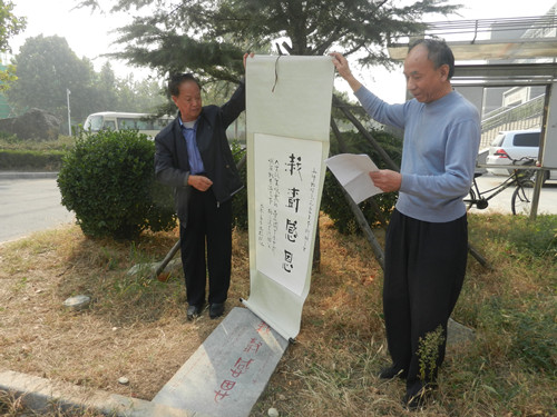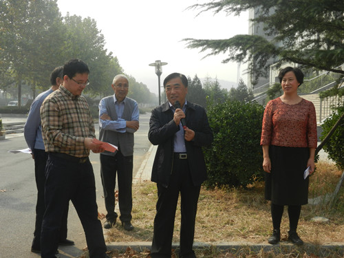 活动现场,老一辈校友重返母校难掩心中的激动,他们向到场的50多名学子讲述了“感恩树”的来源与发展,并期盼同学们好好爱护这株感恩树,让感恩精神延续千秋万代,让每一位学子都感受到物电学院的优良传统。王焕斌表示,老一辈校友通过自身的不懈奋斗,在各所高校的教育岗位上都取得了骄人成绩,为学校赢得了荣誉,他代表学校向55级校友回馈母校的行为表示衷心的感谢。胡桂香提到, 55级校友为山师莘莘学子做出了优秀表率,值此建校65周年之际,欢迎校友回校团聚,山师永远是学生的家。随后举行了备受关注的揭幕仪式,王焕斌与55级校友共同揭开红布,“栽树感恩”四个大字呈现眼前。感恩碑文字帖由济南知名书法家张玉衡题写,该碑安放在校友捐献的一棵云松树下,寓意对母校的感恩之情延续千秋万代。在仪式最后,全体嘉宾合影留念,临行之际,老校友们不忘对后辈加以叮咛嘱托。他提醒在校学生们珍惜同学情谊,不论身在何地,给予自己帮助最大的莫过于自己的同学。回忆起当初在校时的青葱岁月,来自全国各地的55级校友们纷纷表示难忘和温馨。