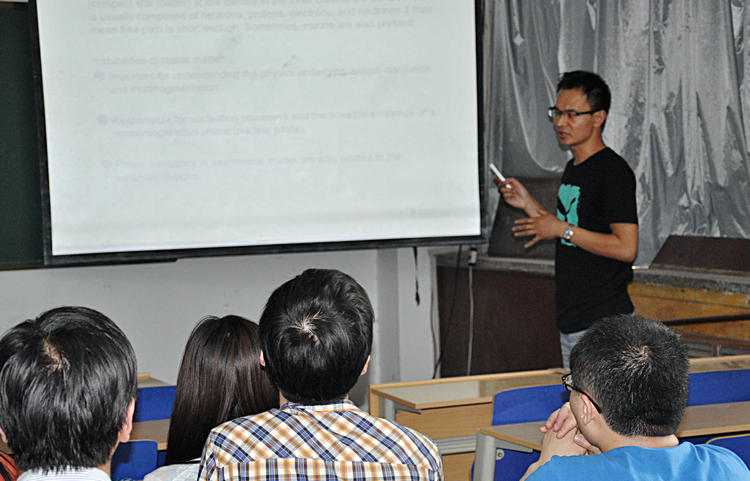 报告中,李晶博士首先介绍了大气层中一些重要的分子反应,并指出氮氧化合物对燃烧化学、温室效应以及大气环境变化等具有重要影响,然后详细地介绍了N2O分子的性质、所构建的基态和激发态的高精度全维势能面的特征,以及在此基础上所进行的相关反应动力学计算。在随后的报告中,房建军博士对恒星物质动力学稳定性研究的重要意义以及线性化变分运动方程组的构建过程进行了阐述,并向大家介绍了利用他们所构建的恒星物质的综合模型,对传输动量和温度的影响以及恒星物质的团簇化所开展的计算研究结果。报告会后两位博士与师生进行了深入地交流和讨论,受到大家的热烈欢迎。