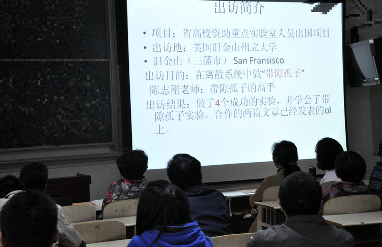 高垣梅老师2012年八月赴美国旧金山州立大学量子光学组,师从陈志刚博士学习离散系统中带隙孤子。高老师主要讲述了她在美国学习的目标、经历、克服的困难和取得的成绩。在报告的最后,高垣梅老师饶有兴趣的向大家介绍了美国的著名自然风光以及风土人情,展示了一些美国的风景照片。并鼓励年轻教师走出国门,增长见识,促进自己的科研水平和创新能力。报告受到与会老师们的欢迎。
