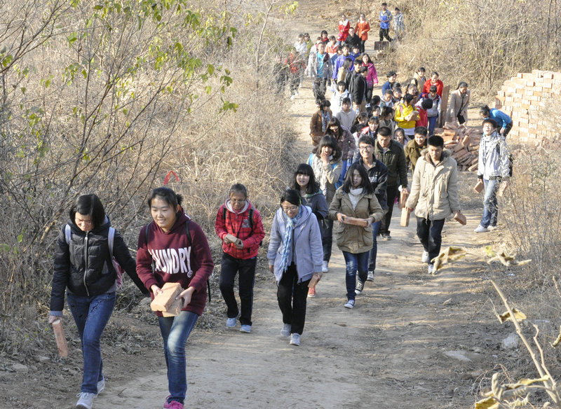 本次活动以“践行党的群众路线”为主题,旨在通过师生联谊的形式促进师生间的交流,进一步贯彻落实党的群众路线教育实践活动。活动伊始,学院党委书记胡桂香现场组织老师们排练《喀秋莎》,为当晚的迎新晚会大合唱做准备。随后,学生党员们高举学院旗帜在前方领路,老师和同学们紧随其后,踏上攀登双龙山的征程。在山口处,老师和同学们看到路边立着写有“义务搬砖”字样的标牌,都毫不犹豫地上前搬起几块砖,携砖前行。在路上,老师与同学们亲切地进行交流,大到专业发展、人生哲理,小到同学们的日常生活,大家侃侃而谈,气氛十分热烈。在登山过程中,同学间、师生间互相帮助的场面到处可见,同学们搀扶着年长的老师,缓步向上攀登。一路上师生们共同欣赏着美丽的景色,感受自然的魅力,欢声笑语回荡在美丽的山路之间。在成功登顶后,大家将砖块放在庙门口,共同进入山庙,瞻孔子庙,入观音堂,观三圣堂,赏恩泽亭……在这样的美景之下,老师与同学们纷纷合影留念,留下美好回忆。最后,大家结伴而归,相互搀扶,心满意足地踏上下山的路。