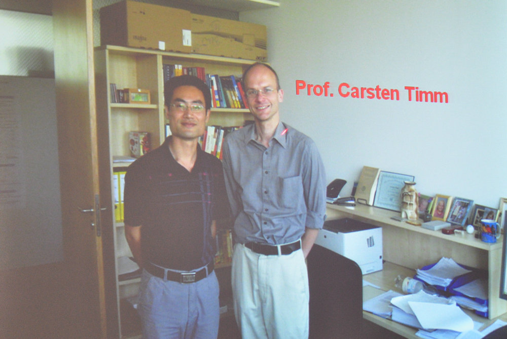 在德国访学期间,胡贵超老师同德国德累斯顿工业大学的Carsten Timm教授密切合作,对有机自旋电子学现象进行了深入的理论研究。他们从微扰论的观点出发,对该现象给出了较好的理论解释,并发现有机磁体晶格畸变对电子自旋密度存在修正。胡贵超老师近年来一直从事有机自旋电子学领域相关理论研究,取得了较好的科研成果。有机自旋电子学是当今物理学新兴而热门的前沿领域,它主要基于有机功能材料,利用电子自旋自由度设计制作性能优良的新型电子功能器件。其中,理解有机材料中载流子特殊的自旋-电荷关系是有机自旋电子学基本任务之一。众所周知,极化子是有机材料的基本载流子之一,它表现在电子及其携带的电荷自旋被晶格畸变所束缚,形成准粒子。胡贵超老师最近发现,在有机磁体中被束缚的电子的自旋和电荷在空间上呈现一定的偏离。