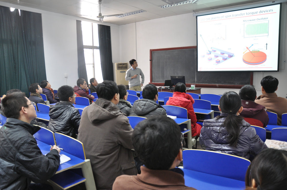 12月21日下午,美国康奈尔大学物理学系的薛林博士来我校进行访问,并在2215教室为物电学院师生作了题为“Characterization of spin transfer torque induced magnetic dynamics in nanomagnets”的学术报告。