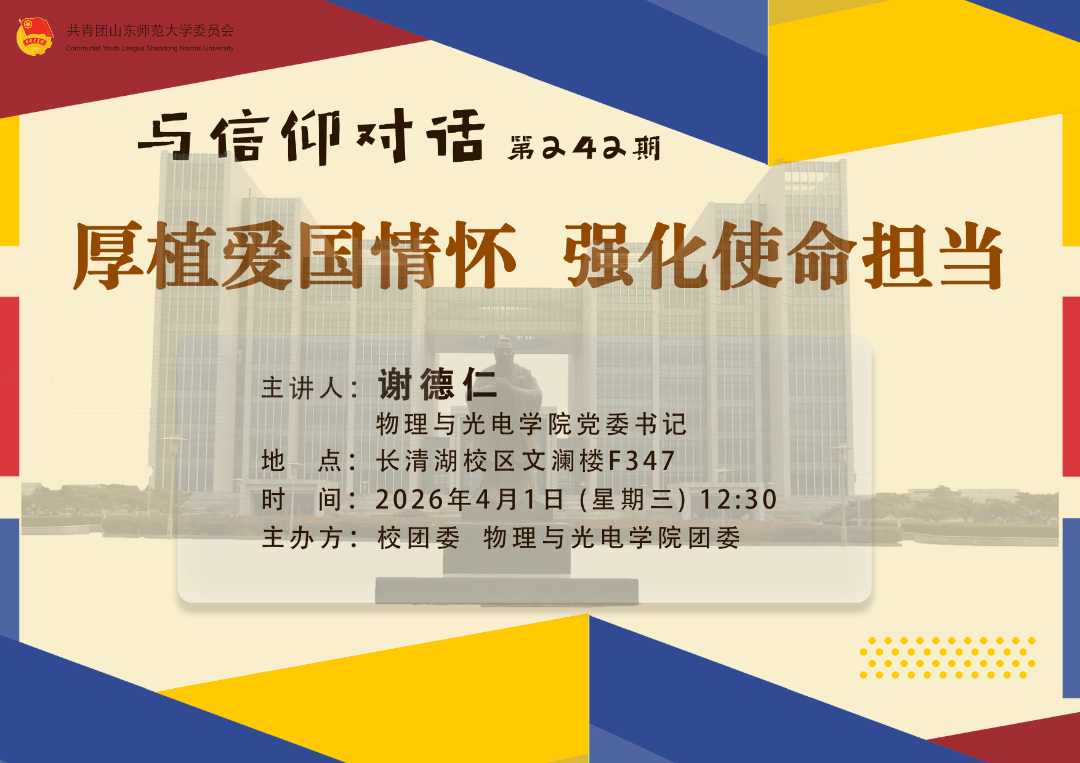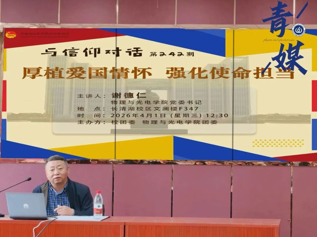 4月1日中午,由校团委主办、物理与光电学院团委承办的第242期“与信仰对话”在长清湖校区文澜楼F347报告厅举行,学院党委书记谢德仁担任主讲人。辅导员尹素月主持本次团课,80余名学生到场参与。