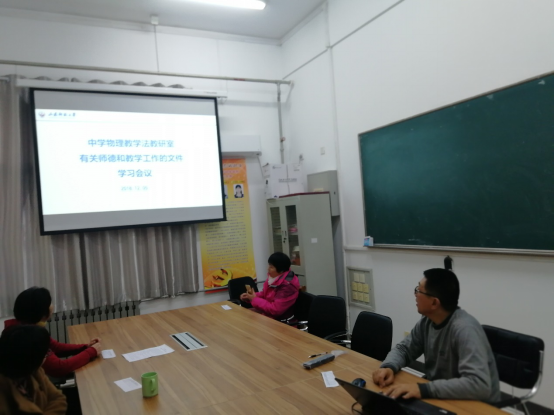 12月6日14-15时,中学物理教学法教研室全体人员在F534会议室进行了有关师德和教学工作的文件学习。教研室老师认真学习了《新时代高校教师职业行为十项准则》,《关于高校教师师德失范行为处理的指导意见》,《教育部关于狠抓新时代全国高等学校本科教育工作会议精神落实的通知》,《教育部关于加快建设高水平本科教育全面提高人才培养能力的意见》,《山东师大教通〔2018〕109号 关于开展试卷、毕业论文自查与整改》等文件。通过学习进一步加深对加快振兴本科教育,构建高水平人才培养体系,全面提高高校人才培养能力的迫切性和重要性认识。学习文件后,教研室老师对于课程建设、教学团队建设、教材、教学论文,教学改革项目,教学进度,期末考试等相关工作进行了讨论。