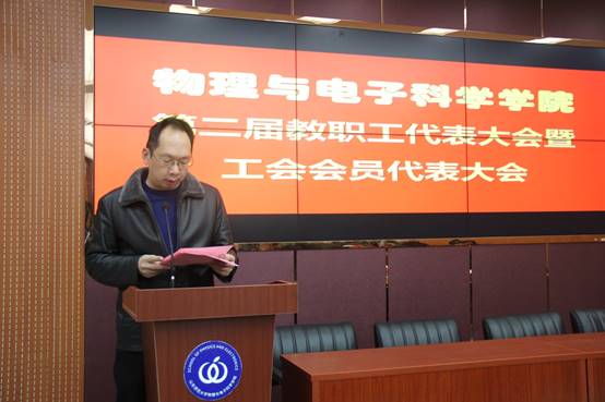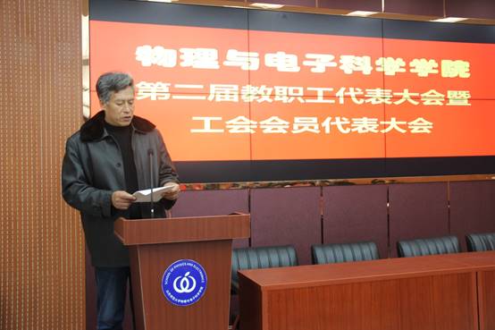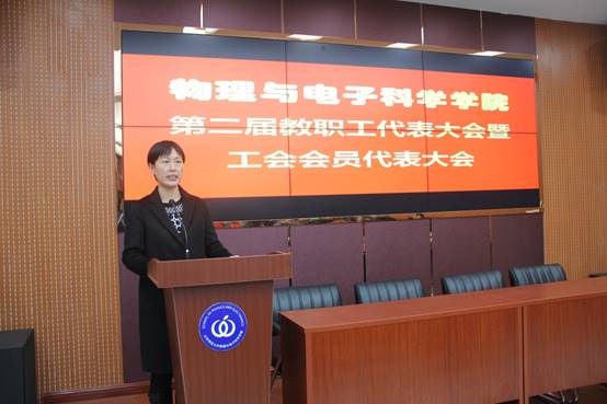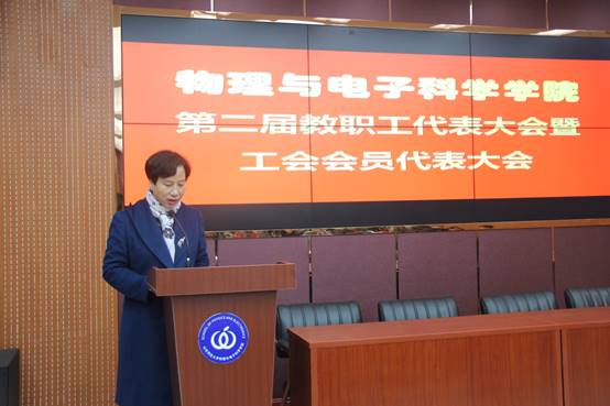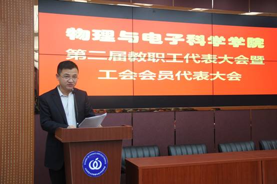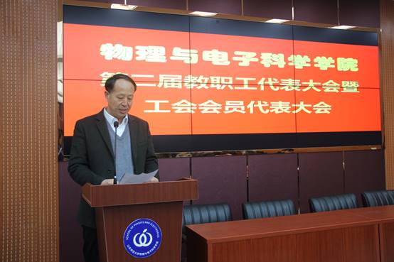 王剑波代表学校工会向大会表示祝贺,他希望各位代表集思广益、畅所欲言,充分发扬当家作主的主人翁精神,并预祝物电学院第二届教职工代表大会圆满成功。