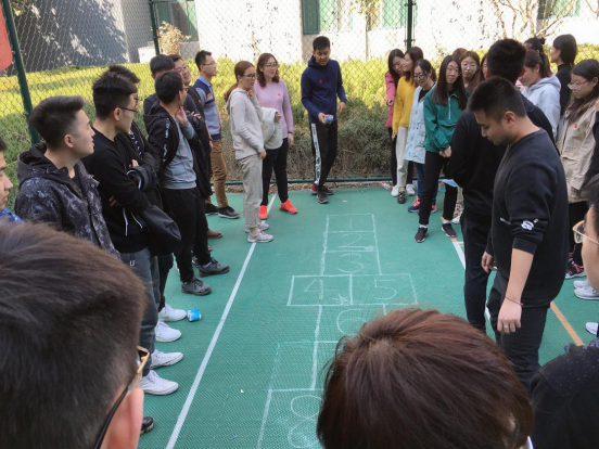 随后进行的是“跳房子”的比赛,比赛要求每组4名队员需接力依次跳完格子,中途若有队员跳错则需从该队员重跳,最后4名队员全部跳完即为比赛结束。比赛尚未开始,同学们就跃跃欲试的讨论战术,体育精神在此起彼伏的加油声、助威声和欢笑声中体现的淋漓尽致。
