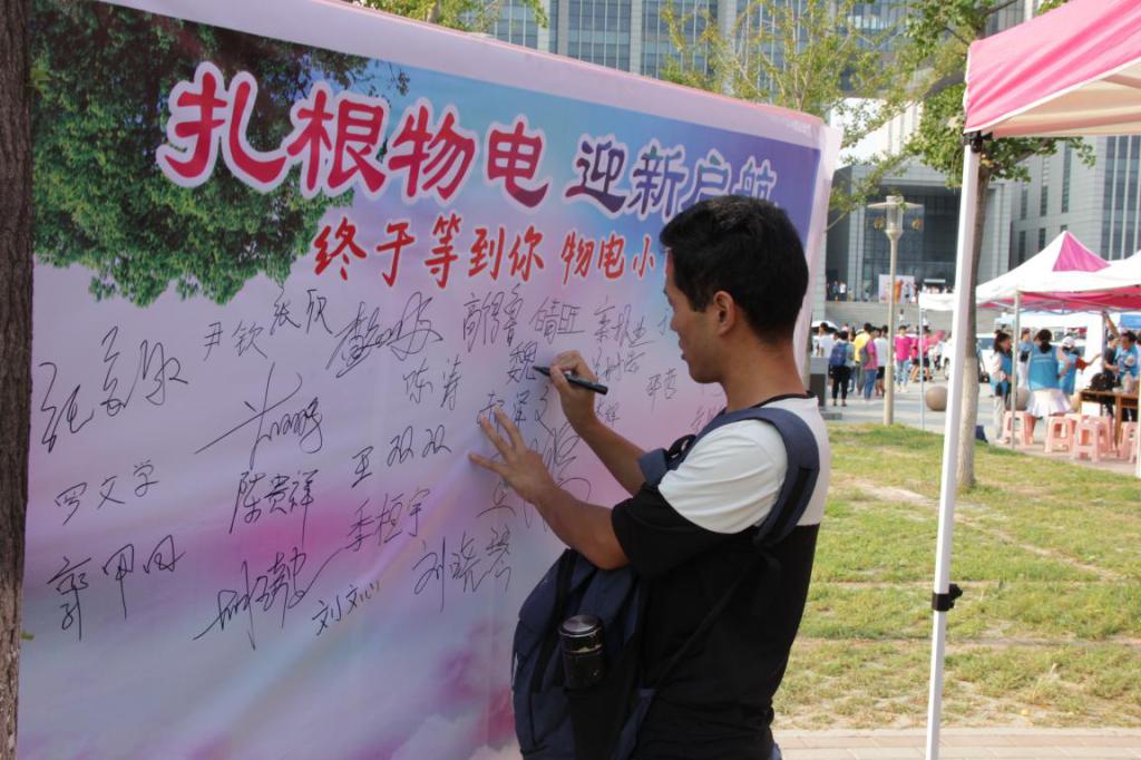为了纪念他们的这一特殊时刻,我院特此为第70名前来报名的幸运新生准备了“铜制书签”,同时为了鼓励大家早来完成报到又给第123名同学赠送了精美的笔记本。我院为前来报到的同学准备了励志签名板,以及前期做好的照片墙,同学们满怀信心地在签字板上签上了自己姓名,提前感受到了物电学院大集体的温暖。学院还为每个学生录制了新学期对自己的学习生活畅想的视频,这将成为他们毕业离开学校时最美好的记忆,希望他们倾吐的这些展望与梦想能成为鞭策他们不断前进的动力,圆满的度过美好的研究生生涯。