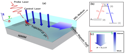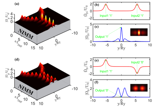 谭超华副教授受到光学Stern-Gerlach效应的启发,提出了通过外梯度磁场来操控负折射率超材料—主动拉曼增益介质界面上传播的表面极化激元(与表面等离激元类似的表面电磁模式)的理论方案,发现该系统支持超低损耗的表面极化激元孤子,通过施加梯度磁场可以使极化激元孤子的传播轨迹发生偏转,通过设计梯度磁场的形式可以实现传播轨迹的动态调控。课题组基于此效应,结合孤子之间的非线性相互作用,设计了一种新奇的表面极化激元逻辑门,这种微纳尺度的全光逻辑门在外磁场的辅助下实现类XNOR逻辑操作。这些结果有望在未来的片上光计算和超高速信息处理方面获得应用。