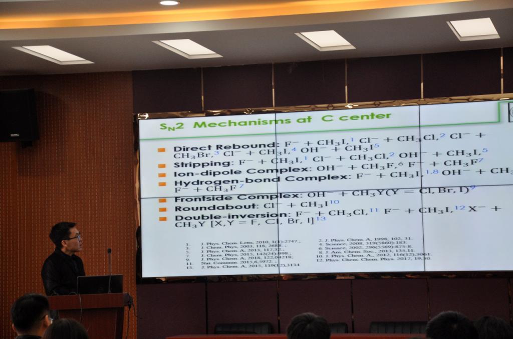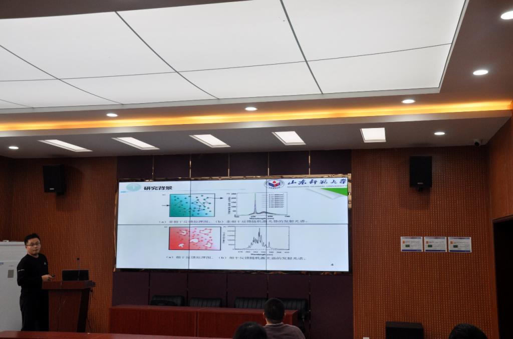 王敦友从合成双分子的亲核取代反应的重要性层面进行了汇报,本次研究不仅发现了单态转换机制,而且还发现了复合转换机制的三个过渡态,研究结果表明,当碰撞能增加,SN2反应性降低,提取质子的反应性将会增加。赵睿向我们介绍了多层光学相干断层扫描图像的玻璃膜疣自动探测技术,近年来,基于光学相干断层扫描图像的疾病探测技术业已成为医学图像处理领域中的研究热点,这项技术是检测早期年龄性黄斑变性的前提,探测的结果有助于在drusen发展和治疗过程中对其进行对比、量化与监测。石俊俊就杂化等离激元波导中的二次谐波效应进行汇报。本次研究的创新点在于利用波导中模式间的相互作用,提供了一种高效的纳米相干非线性光源,同时利用傅里叶成像来研究二次谐波的发射特性,且准确识别SHG中具体参与的模式。该研究构建非线性光棚耦合器,提升了高损波导中的非线性转换效率。