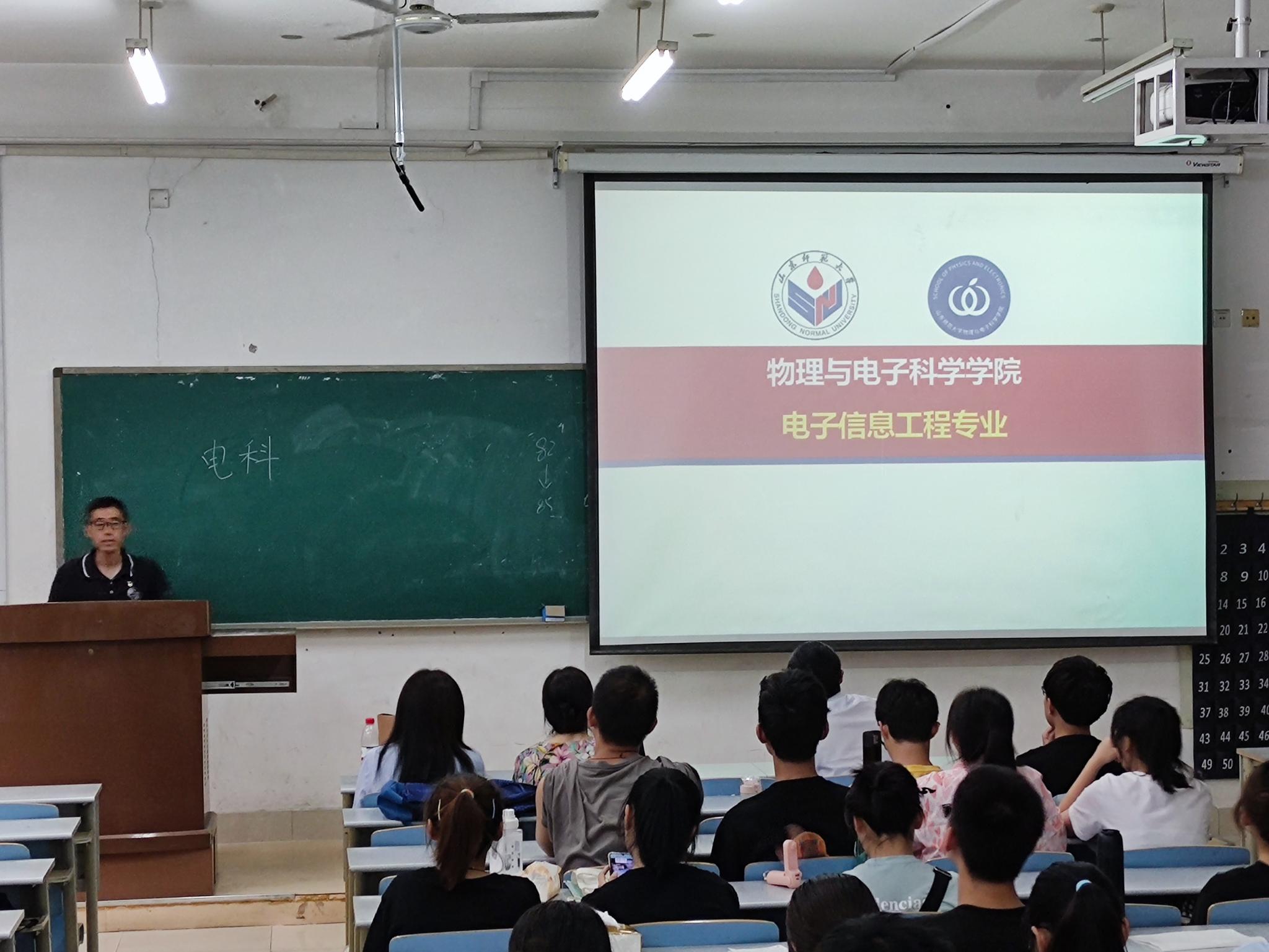 蔡阳健向同学们介绍了学院光学与电子技术专业现有的强大的师资力量以及具有的高端科研平台,能够为本专业的同学提供完备的科研设施。他鼓励同学们选择光学与信息技术专业。他指出,光电专业还具有较高的保研率和考研率,就业方向广泛,可涉及科研教学、航空航天、研发运行管理等多个方面。任莹莹从课程设置和专业背景等方面对光电专业作出补充,并鼓励同学们参观光学实验室,感受该专业浓厚的科研气氛。岳伟伟指出,电子信息工程作为国家一流专业,具有相对悠久的历史,目标培养德智体全面发展的具有创新精神和实践能力的,具备专业技能的高素质人才。王晶晶通过专业背景、师资队伍、建设平台、课程体系等方面向同学们详细地介绍了电子科学与技术专业,并且用一段因特尔芯片制造过程的视频让同学们对于该专业有了更加深刻的了解,她指出,该专业致力于培养具备微电子、集成电路、嵌入式、人工智能等领域相关理论知识和实践能力,能在电子系统的设计制造、科学研究和教学等工作的复合型专业人才。赵曰峰对本次分流会做出总结,他认为不论选择哪个专业,电子信息都具有广阔的发展前景和优良的就业待遇,并强调专业选择要遵从自愿原则,拒绝盲从,要慎重综合考虑。