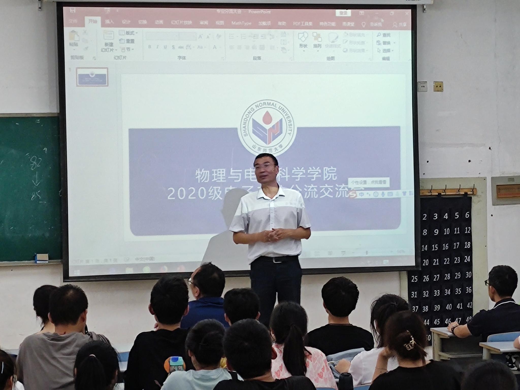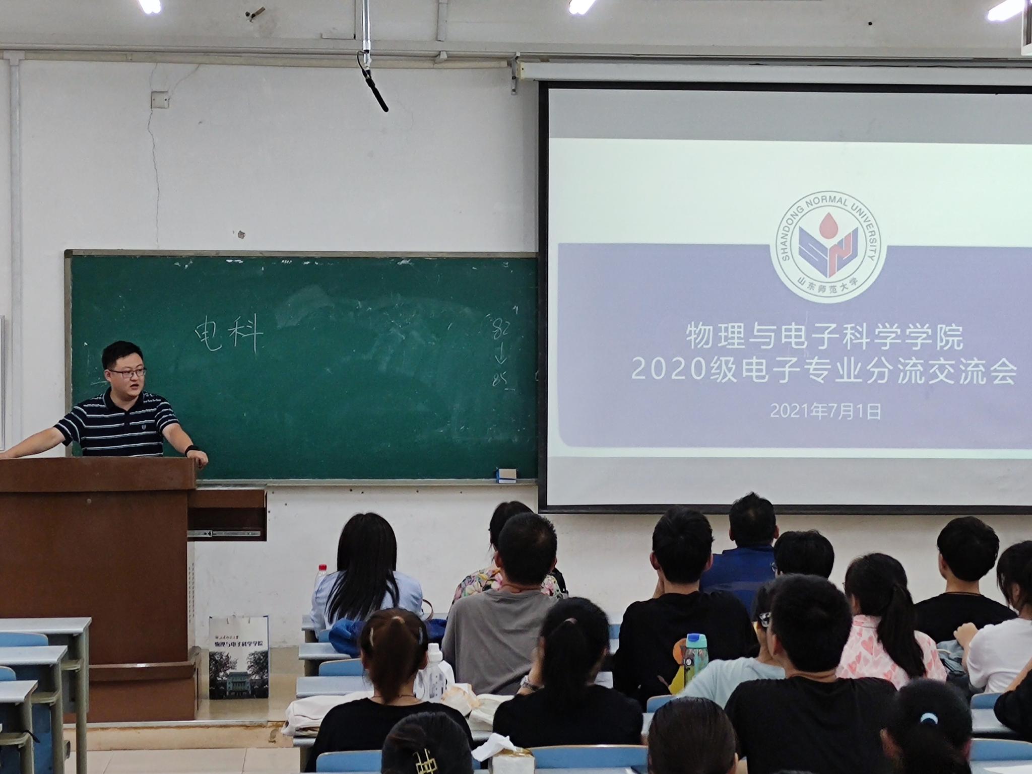 7月1日下午,英国365上市公司于长清湖校区文澜楼C224室举行2020级电子专业分流交流会,院长蔡阳健、副院长赵曰峰、光电专业负责人任莹莹副教授、电子信息工程专业负责人岳伟伟副教授、电子科学与技术专业负责人王晶晶副教授出席本次交流会,20级辅导员史睿,2020级全体电子信息类同学百余人参加会议。