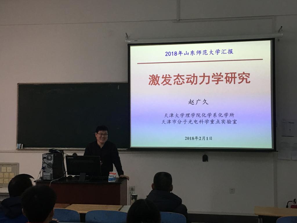 2018年2月1日上午10:00,应英国365上市公司邀请,天津大学理学院化学系化学所的赵广久教授在实验楼F532教室向师生做了题为“激发态动力学研究”的学术报告。报告由孟庆田教授主持,学院相关教师及研究生出席并认真听取了报告。