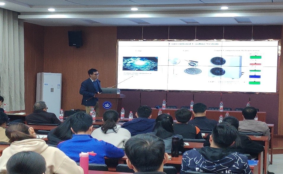 柔性电子设备是当今电子器件的发展方向,器件的制备和集成过程需要用到柔性的金属与半导体材料。首先马教授介绍了他所制备的新型的柔性导电材料,其作用是代替目前的刚性导线用在电路里。其次,高集成度的电子芯片也需要更有效的制冷技术来延长使用寿命,并替代传统的氟利昂(污染环境)。最后,马儒军教授表示他所利用的柔性铁电电热聚合物膜和静电驱动机制使固态制冷聚合物膜在静电力驱动下可以有效的在热源与散热器之间传递热量。可逆的静电力的使用,降低了寄生功率的消耗,并通过聚合物膜与热源或散热器之间瞬间形成良好的热接触,实现了有效的热传递。马儒军教授在报告会后和与会教师、研究生本科生进行了热烈的讨论交流,受到与会师生的欢迎。