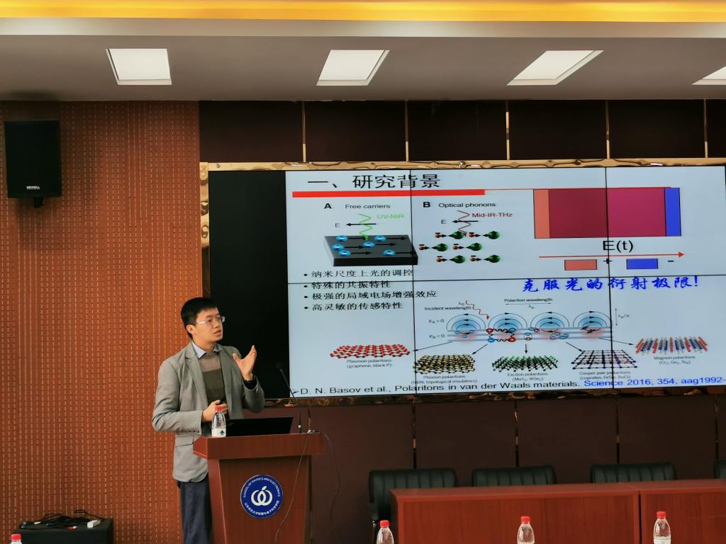 戴志高教授就低维材料极化激元做了详细的介绍。首先戴教授介绍了传统低维贵金属阵列及其复合材料中的表面等离激元增强机理。分析了基于贵金属颗粒阵列间局域表面等离激元的耦合热点的产生,简述了在拉曼、催化中的增强应用,由此拓宽了在增强光学、非线性效应、传感、成像以及新型人工超结构材料设计等领域应用前景。第二部分报告了二维层状范德华材料中的极化激元。戴教授通过散射型扫描近场光学显微镜报告了α-相三硫化钼中高度受限的声子-极化子的真实空间映射。研究结果揭示了α-MoS3中声子极化子的亚衍射聚焦和方向引导特性,进一步显示出其在近场光学导引,成像和聚焦中的潜在应用。戴教授的讲座内容丰富,深入浅出的向我们展示了从低维到二维不同材料维度的等离激元性质,极大地启发了我院师生。戴教授讲座风趣幽默并且和师生进行了深入的互动交流。通过此次讲座,增强了我院师生对对纳米光学前沿的了解,同时进一步加强了我院与国内外高校的科研交流与合作。