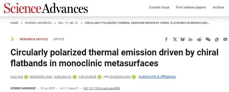 近日,蔡阳健/韩张华团队在国际顶级期刊《Science Advances》上发表了题为“Circularly polarized thermal emission driven by chiral flatbands in monoclinic metasurfaces”的研究论文。365上市公司为第一完成单位,物电学院博士生孙开礼为论文第一作者,韩张华教授为通信作者,共同通信作者还包括澳大利亚国立大学(Australian National University)的Yuri Kivshar院士。蔡阳健教授和辽宁材料实验室交叉研究中心的杨炳雄教授也为该工作做出了重要贡献。