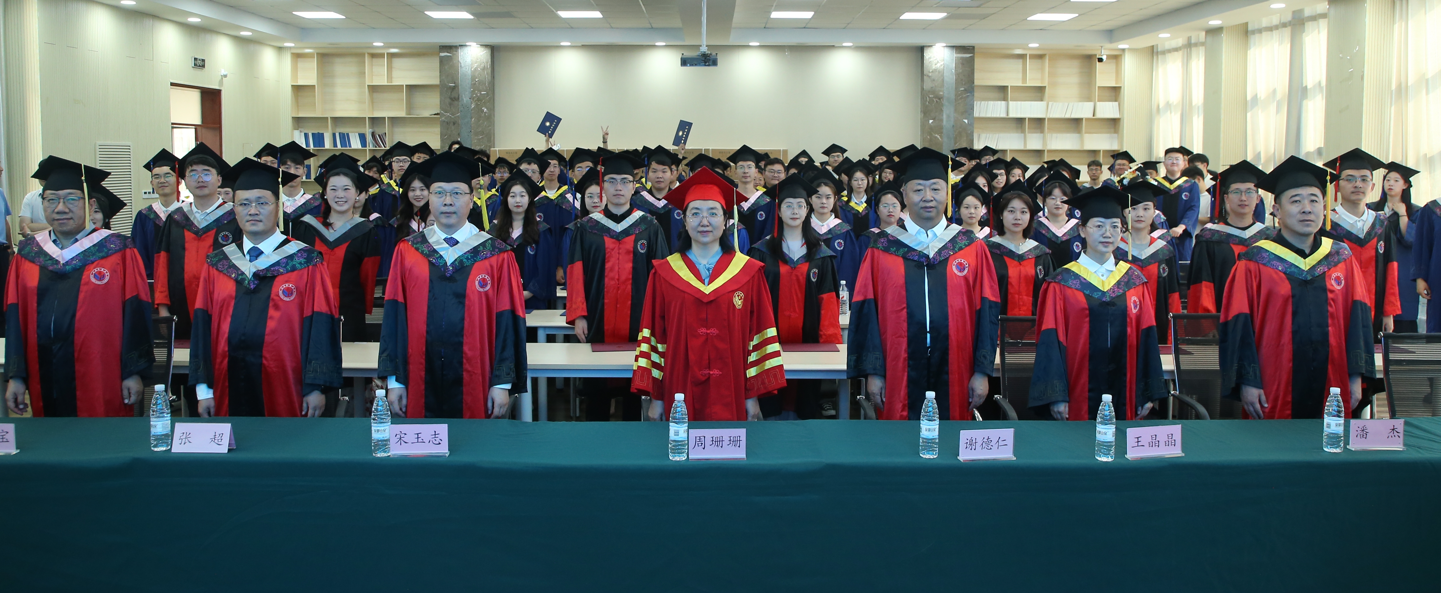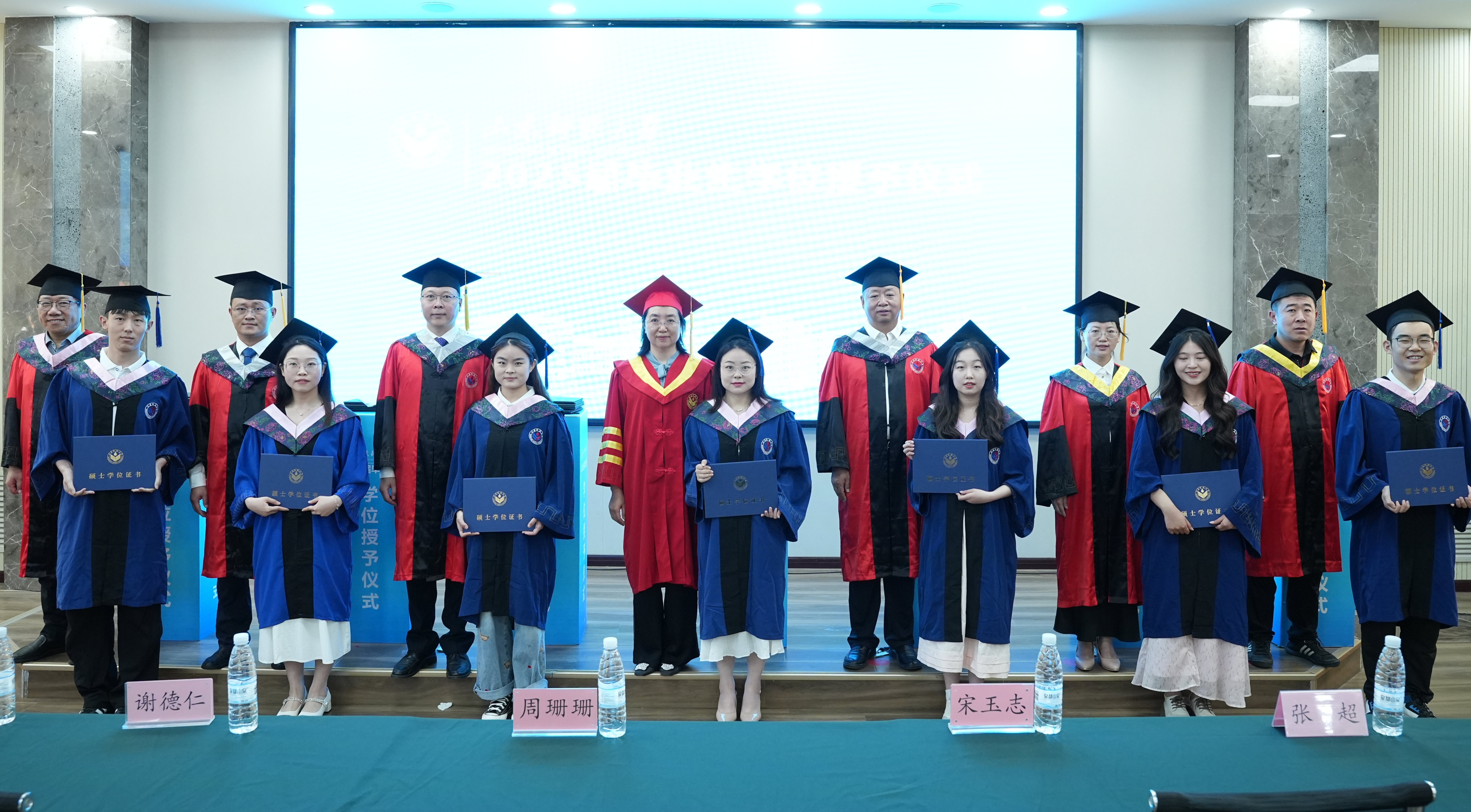 在雄壮激昂的国歌声中,学位授予仪式正式开始。周珊珊副校长及各位领导、导师共同为毕业生行“拨穗礼”、扶正学位帽,郑重授予学位证书,并与毕业生亲切握手、合影留念。