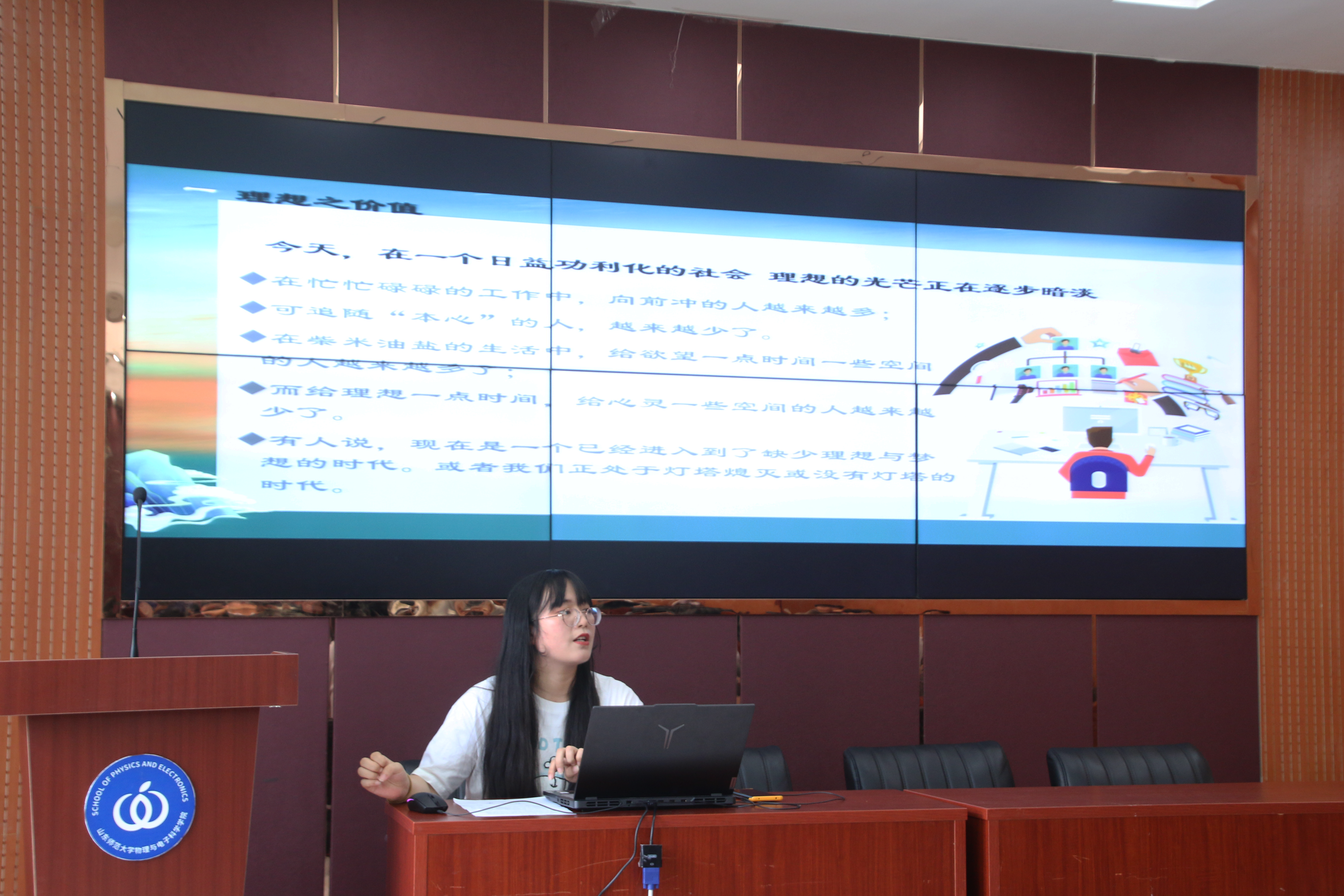 杨岚先是带大家回顾了五四精神的诞生,一起重读了革命先辈用青春热血书写的壮美篇章,感怀先辈的理想信念和不屈精神。接着杨岚结合当前实际用举例子的方式说明理想的实践性,时代性,通过解释理想与幻象、空想的概念,来区分它们的本质区别,将理想分为生活理想,职业理想,道德理想和社会理想四类,她强调,崇高的理想和信念,可以成为所有奇迹的萌发点,能够成为一个人一生的动力,如果一个人确定了崇高的理想信念,他就会自觉地以自己的全部感情,意图和行为服从于这一目标,他就会达到理想的客观效果,就会得到肯定的价值评估。杨岚从大学生对理想的追求这一小方面,来引出社会大方面的精神动力不足,重物质轻实质,重科技轻人文,重智育而轻德育的现象。活动最后,杨岚总结了正确理解理想与现实的关系,大学生实现理想要做到:建立良好习惯、立即行动、每天做三件事“看见别人看不见的地方,算别人算不清的账,做别人不做的事”。最后,杨岚带领团员们重温入团誓词,鼓励大家争当伟大理想的追梦人,争做伟大事业的生力军。