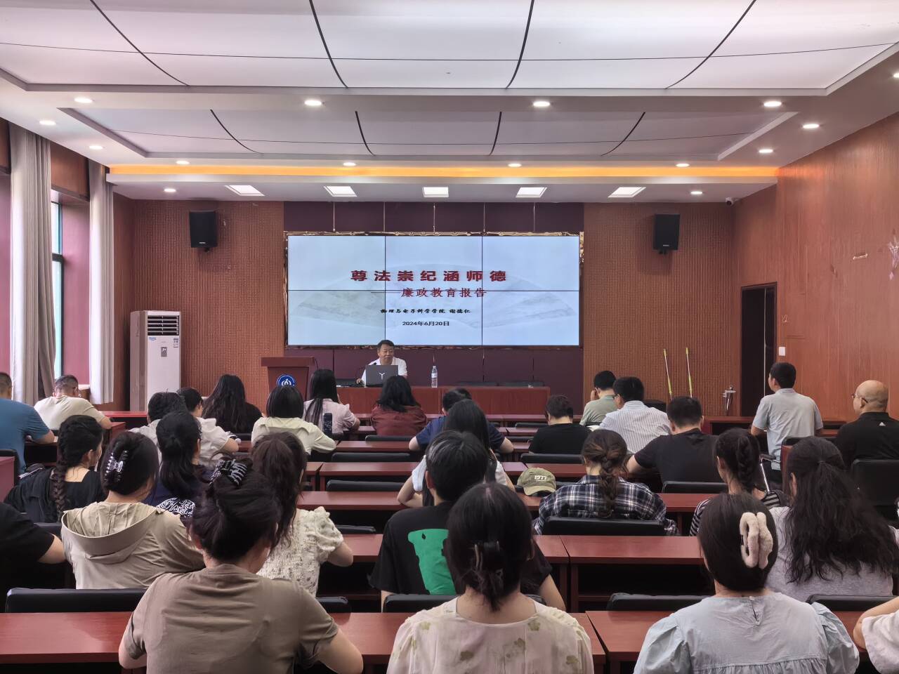 为推进党纪学习教育走深走实,强化党员队伍党性教育和纪律规矩意识,进一步加强党风廉政和师德师风建设,6月20日下午,物电学院党委在文澜楼F347报告厅举办“尊法崇纪涵师德”廉政教育报告。本次报告由学院党委书记谢德仁担任主讲,学院领导班子、党委委员、教研室主任、辅导员及各支部支委委员参加。