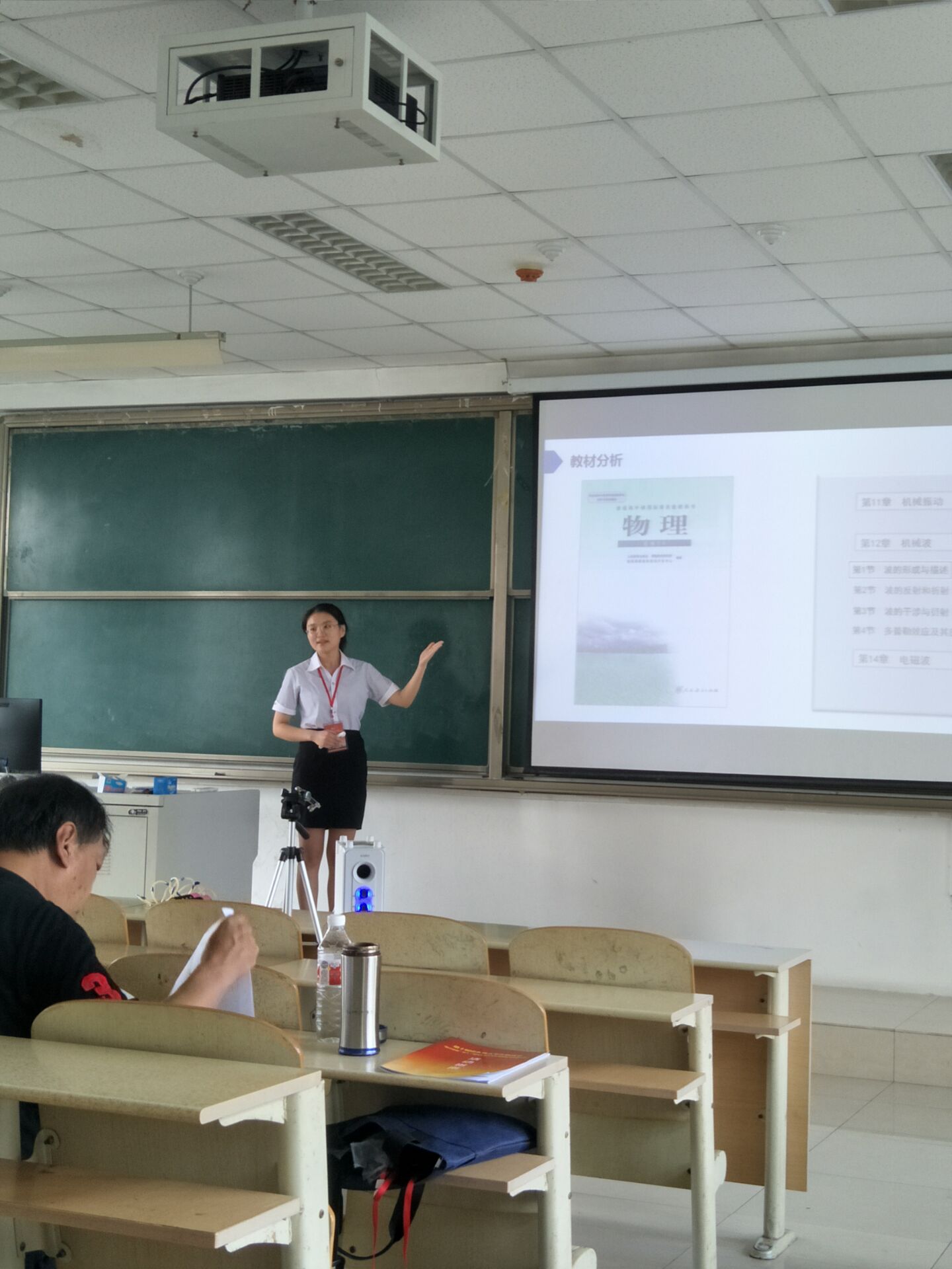 比赛过程中,选手们全面展示了学院良好的精神风貌与扎实的教学素养,得到了评委们的肯定。其中,物电学院学科教学(物理)研究生宋鑫玉,展示了《波的形成与传播》,以培养学生核心素养为指导,教学设计逻辑合理思路清晰,巧妙结合了翻转课堂、探究实验、多媒体演示、拟人化教学等多种新颖的教学模式,还利用小音箱、平面镜和激光笔自制了教具,向学生直观展示出声音在空气中的传播形式。环环相扣,娓娓道来,在传递知识的同时充分提现了学生的主体性,获得了评委老师和观众的一致好评。交流会最后,尤洪浩等六名同学被推荐在交流会上进行现场展示,其中宋鑫玉、杨珊珊等五名同学获得“教学技能标兵”称号,辛明浩、杨珊珊在教具展示环节被推选为“自制教具能手”称号。