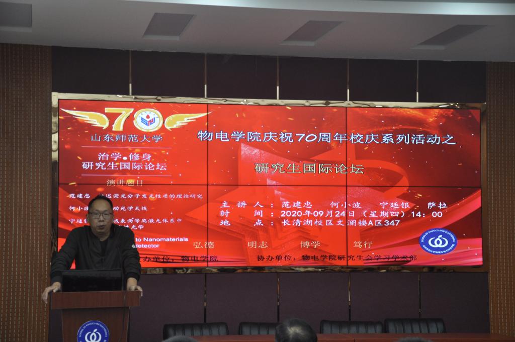 为普及前沿光学发展现状,培养物电学子治学修身的科研素养,英国365上市公司于9月24日在长清湖校区文澜楼A区347会议室召开了庆祝70周年校庆系列活动之青年教师学术沙龙暨研究生国际论坛。院长蔡阳健、副院长宋玉志、副院长任俊峰和60余名研究生参加论坛,由青年教师范建忠、何小波、宁廷银和巴基斯坦留学生萨拉博士主讲。