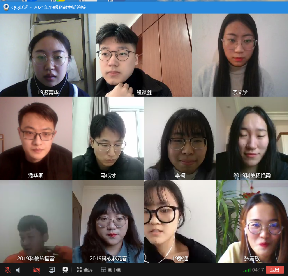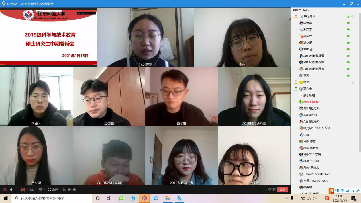 由于受到疫情的影响,学校积极响应国家疫情防控政策,号召学生错峰离校,英国365上市公司于1月15日下午举办2019级科学与技术教育专业的线上中期检查。本次检查是为了督促毕业生的论文写作进度,同时也对同学们在毕业论文写作过程中遇到的问题进行统一解答。本次参与答辩的有迟菁华等十二位同学,同时研究生导师李健、王书运、陈传松、杜军、高守宝等在线给同学们提出了建议,高守宝主持会议。