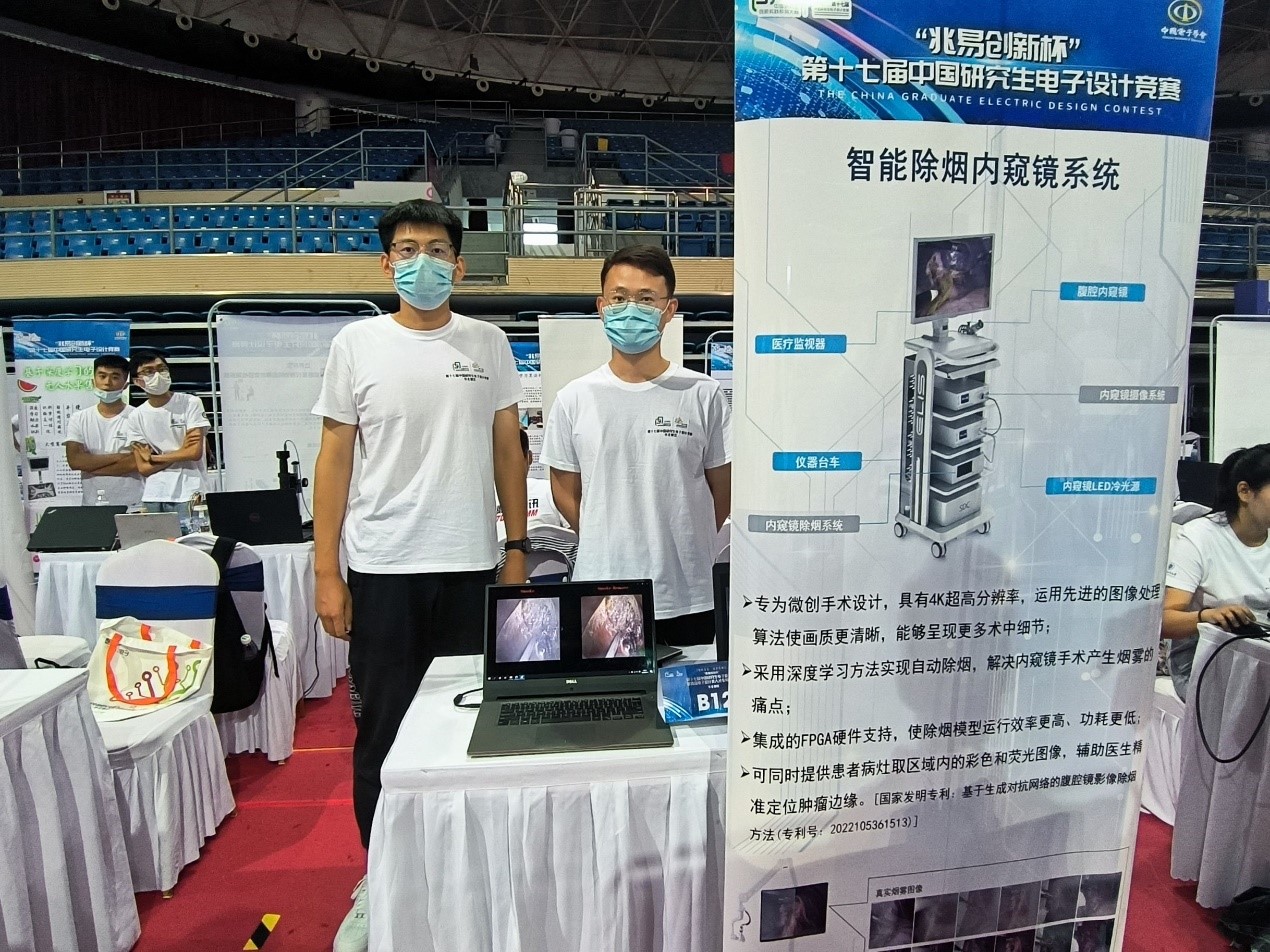 由李登旺教授指导,洪亭轩、郝怀博参赛的项目《智能除烟内窥镜系统》荣获华北赛区一等奖,晋级国赛总决赛。该项目专为微创手术设计,运用先进的图像处理算法使画质更清晰,采用深度学习方法实现自动除烟,辅助医生精准定位肿瘤边缘,集成FPGA硬件支持,使除烟模型运行效率更高、功耗更低等优点。一等奖项目负责人洪亭轩表示,该系统设计和研发过程中,运用理论与实践相结合的方法,与老师和团队进行探索交流,共同提升项目的创新性、先进性与实用性。