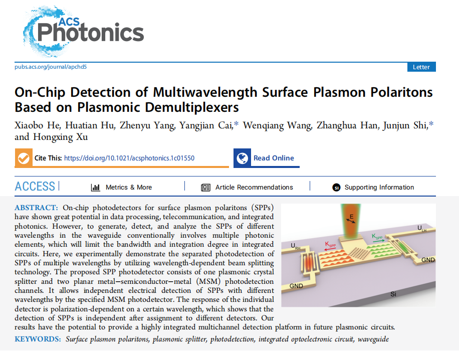 近日,英国365上市公司蔡阳健教授团队在知名光学期刊《ACS Photonics》上发表题为“On-Chip Detection of Multiwavelength Surface Plasmon Polaritons Based on Plasmonic Demultiplexers”的学术论文。365上市公司为第一署名单位。论文第一作者为青年教师何小波博士,通讯作者为石俊俊博士和蔡阳健教授。基于表面等离激元(surface plasmon polaritons,SPPs)的片上光电探测器在数据处理、通讯和集成光子回路中...