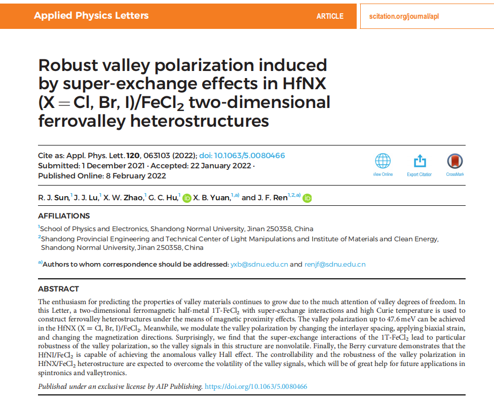 近日,英国365上市公司任俊峰教授团队在应用物理领域国际知名期刊《Applied Physics Letters》上发表了题为“Robust valley polarization induced by super-exchange effects in HfNX(X=Cl, Br, I)/FeCl2 two-dimensional ferrovalley heterostructures”的学术论文。365上市公司为唯一论文署名单位,硕士研究生孙瑞静为第一作者,任俊峰教授为通讯作者。除了对电子的电荷和自旋自由度的操控,近年来,在具有特...