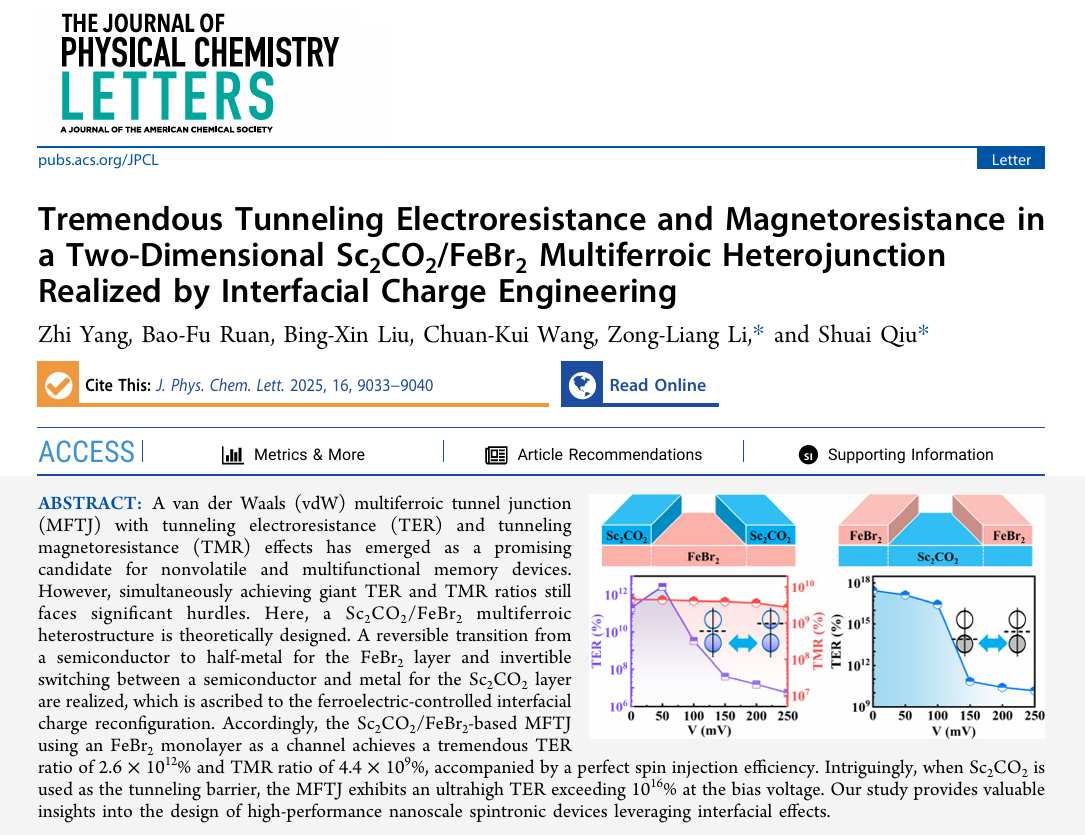 近日,英国365上市公司王传奎教授团队在自然指数期刊《The Journal of Physical Chemistry Letters》上发表题为“Tremendous Tunneling Electroresistance and Magnetoresistance in a Two-Dimensional Sc2CO2/FeBr2 Multiferroic Heterojunction Realized by Interfacial Charge Engineering”的学术论文。365上市公司为唯一论文署名单位,博士研究生羊志为第一作者,李宗良教授和青年教师邱帅为通讯作者。范德华多铁隧道结兼具隧穿电阻 ...