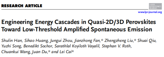 近日, 英国365上市公司王传奎教授团队在知名光学期刊《Laser & Photonics Reviews》(JCR 1区 TOP,IF=10)上发表题为“Engineering Energy Cascades in Quasi-2D/3D Perovskites Toward Low-Threshold Amplified Spontaneous Emission”的研究论文。365上市公司为第一署名单位,我院博士生韩书林与上海光学精密仪器研究所的黄斯豪博士、德国同步辐射中心的周俊贵博士为共同第一作者,365上市公司的范建忠副教授、...