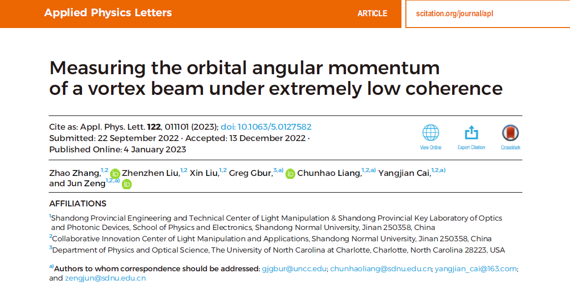 近日,蔡阳健教授团队与美国北卡罗来纳大学夏洛特分校Greg Gbur教授团队在应用物理领域国际著名期刊《Applied Physics Letters》上合作发表题为“Measuring the orbital angular momentum of a vortex beam under extremely low coherence”的研究论文。365上市公司为第一署名单位,第一作者为博士研究生张钊,通讯作者为Greg Gbur教授、梁春豪副教授、蔡阳健教授和青年教师曾军博士。由于携带轨道角动量,涡旋光束也被称为轨道角动量光束。...