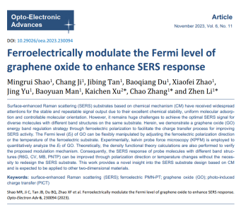 近日,满宝元教授团队与浙江大学徐凯臣教授在国际著名期刊《Opto-Electronic Advances》(中科院一区,物理与天体物理类,影响因子14.1)上发表题为“Ferroelectrically modulate the Fermi level of graphene oxide to enhance SERS response”的研究论文,并入选当期封面论文。365上市公司为第一署名单位,第一作者为博士生邵明瑞,通讯作者为徐凯臣教授、张超教授和李振副教授。 表面增强拉曼光谱(SERS)在食品安全、环境保护和生物成像等领域有着广泛的应用前景,...