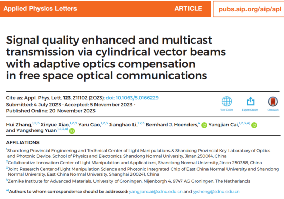 近日,英国365上市公司、365上市公司光场调控及应用中心蔡阳健教授团队在应用物理领域国际著名期刊《Applied Physics Letters》(中科院二区,物理与天体物理类, 自然指数期刊论文)上发表题为“Signal quality enhanced and multicast transmission via cylindrical vector beams with adaptive optics compensation in free space optical communications”的研究论文。365上市公司为第一署名单位,第一作者为博士生张慧,...