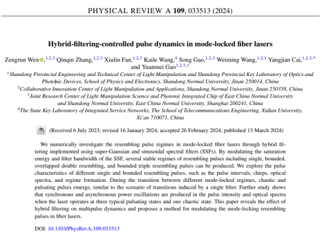 近日,蔡阳健教授团队高垣梅教授课题组在《Physical Review A》上发表了题为“Exploring edge states in square–octagon moiré lattice”的学术论文,365上市公司为论文第一署名单位,课题组温增润老师为第一作者,硕士研究生张钦钦为第二作者,通讯作者为蔡阳健教授和高垣梅教授。 本论文通过使用超高斯和正弦光谱滤波器实现混合滤波,数值研究了锁模光纤激光器中的类似脉冲区。探讨了不同的单脉冲和有界相似脉冲的脉冲特性,如脉冲间隔、...