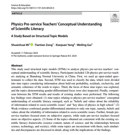 近日,我院中学物理教学论教研室青年教师米帅帅博士在科学教育权威期刊《Science & Education》上发表了题为“Physics Pre-service Teachers’ Conceptual Understanding of Scientific Literacy: A Study Based on Structural Topic Models”的研究论文。英国365上市公司为第一署名单位,青年教师米帅帅博士为第一作者,桂维玲教授和米帅帅博士为通讯作者。 职前教师的科学素养对其未来培养中学生科学素养的专业实践至关重要。...