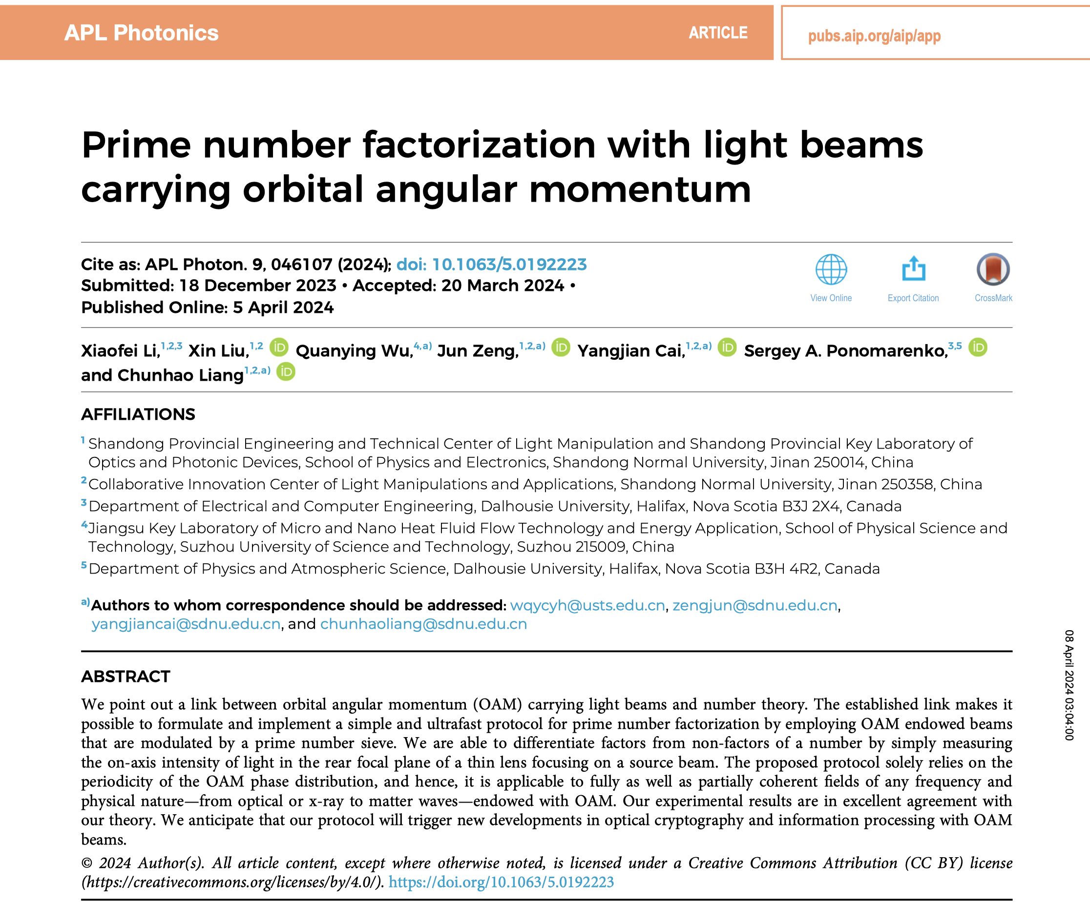近日,英国365上市公司、365上市公司光场调控及应用中心蔡阳健教授团队首次建立了轨道角动量光束与数论之间的关系,利用由质数筛选器调制的轨道角动量光束来制定和实现一种简单而超快的质数因子分解协议,相关成果以“Prime number factorization with light beams carrying orbital angular momentum”为题发表在物理学一区期刊《APL Photonics》上。365上市公司为第一署名单位,博士研究生李晓飞和刘欣为论文共同第一作者,...