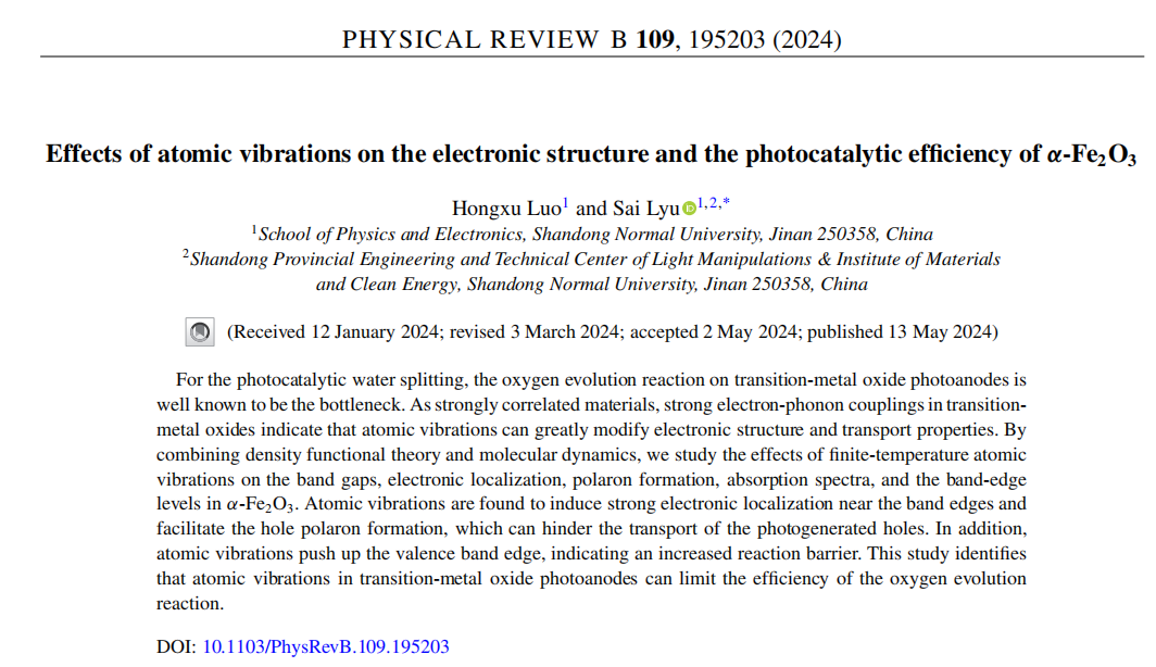 近日,任俊峰教授团队吕赛副教授课题组在凝聚态物理领域期刊《Physical Review B》上发表了题为“Effects of atomic vibrations on the electronic structure and the photocatalytic efficiency of α-Fe2O3”的学术论文。365上市公司为论文唯一署名单位,课题组硕士研究生罗宏旭为第一作者,通讯作者为吕赛副教授。 金属半导体氧化物中强电声耦合作用可显著改变其电子结构和物理性质。本文以氧化铁为例,研究了晶格振动对其电子结构的影响。...