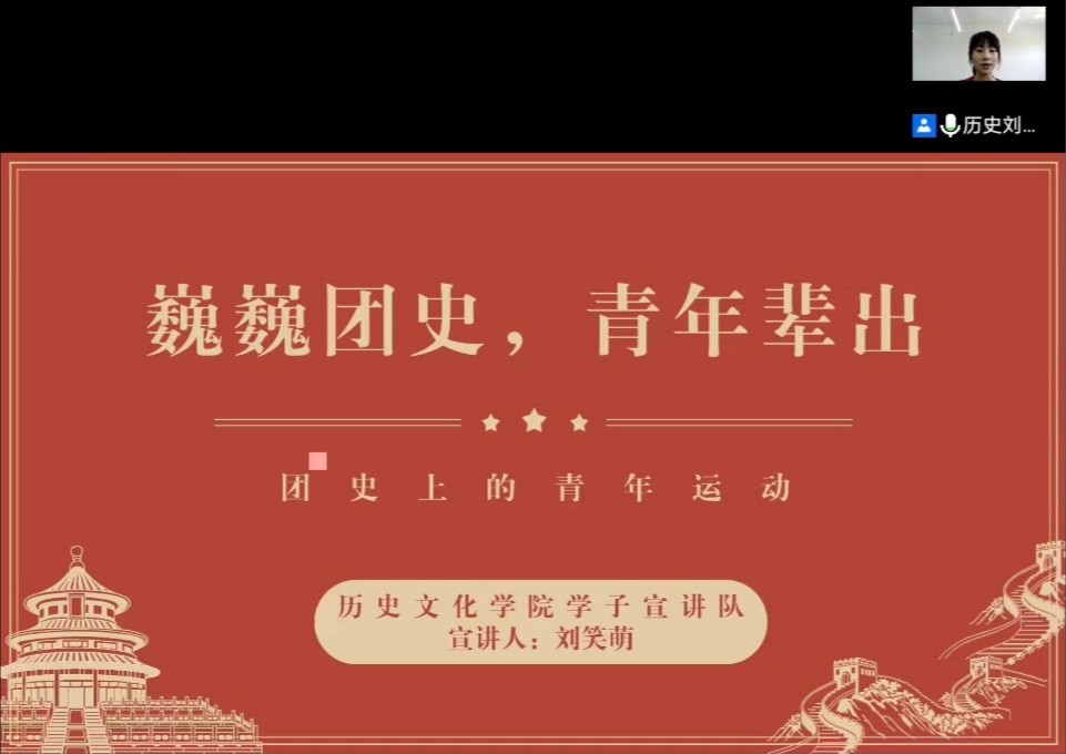 为引导广大青年学生更加直观形象地了解共青团历史,坚定青春理想,厚植爱党爱国情感。5月3日中午,英国365上市公司开展“团史上的青年运动”主题团聚青春团校培训活动,历史文化学院宣讲团成员刘笑萌担任活动主讲人,40余名团校学员“云端”参加本次活动。刘笑萌以中国共产主义青年团成立为切入点,紧紧围绕“巍巍团史,青年辈出”的主题展开讲述,通过几个历史事件为节点,带领大家回顾青年学生为抗日救亡所做出的巨大努力...