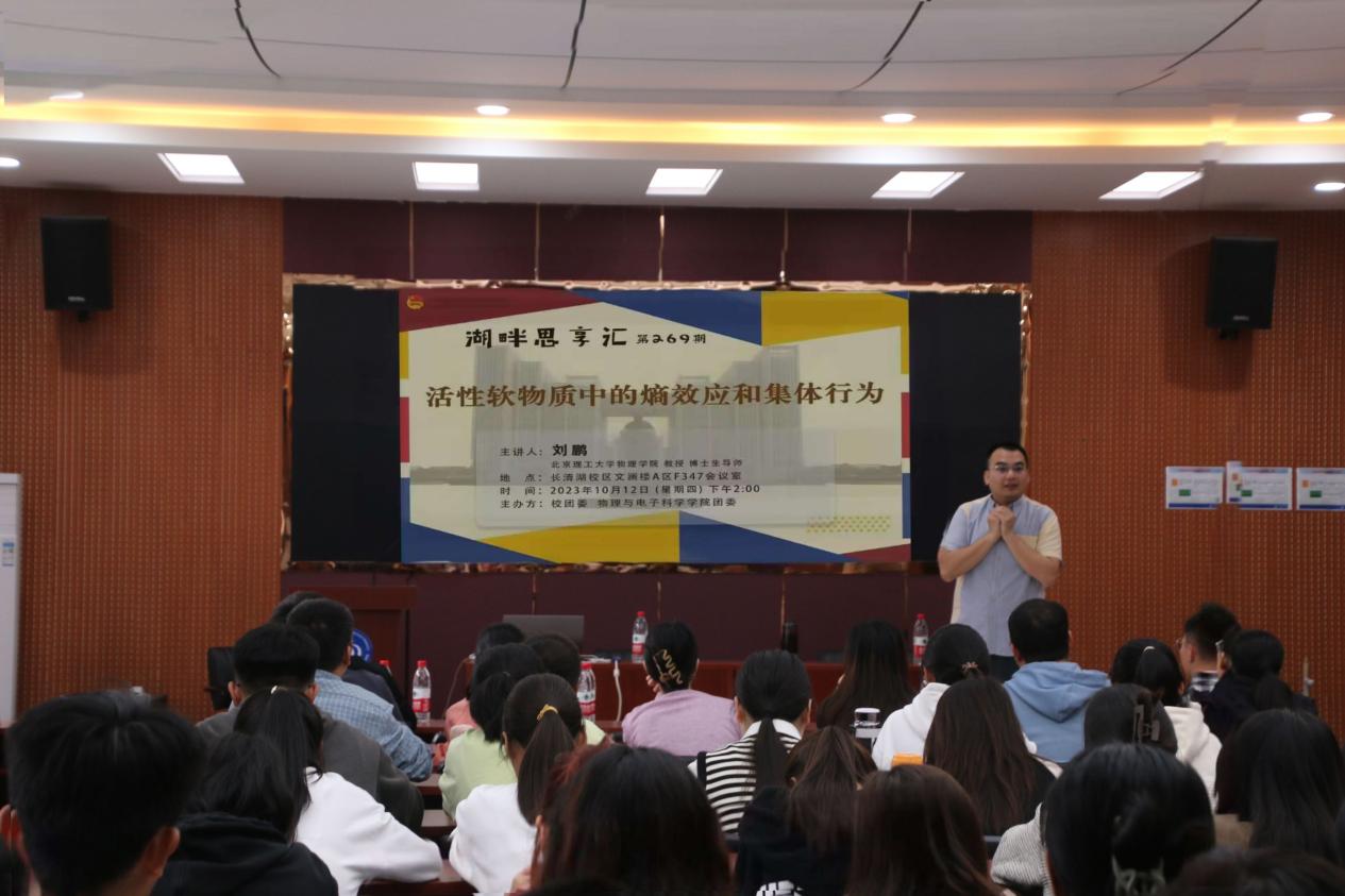 10月12号下午,英国365上市公司于文澜楼A区F347举办湖畔思享汇之“活性软物质中的熵效应和集体行为”专题讲座,北京理工大学物理学院博士生导师刘鹏受邀担任本次讲座主讲人,学院副院长宋玉志出席,60名研究生和本科生参加讲座。刘鹏分别从研究背景、研究内容、研究成果、未来计划四个维度,层层递进,深入浅出地对活性软物质进行介绍。他指出,软物质是一种介于固体和液体之间的新型物质,具有可塑性、延展性、流变性和可逆性等特点。...