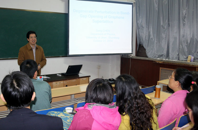 10月31日下午,应英国365上市公司邀请,山东省泰山学者海外特聘专家、博士生导师、济南大学陈刚教授在实验楼0206教室作了题为“石墨烯超晶格能带工程中的简并扰动机制”的学术报告。