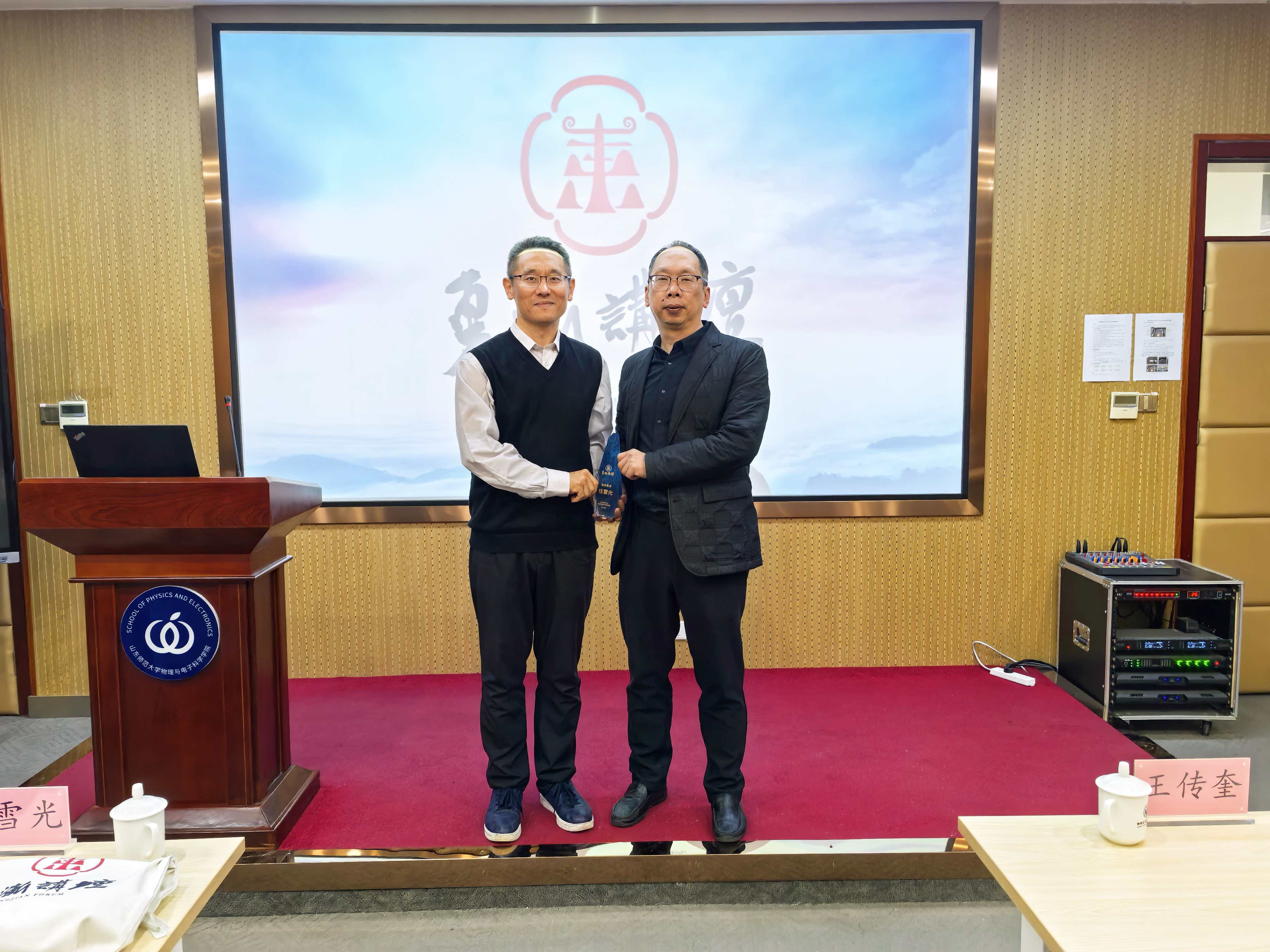 10月25日下午,学院在长清湖校区文渊楼D区301报告厅举行第31期48讲“东渐讲坛”报告会。本次讲坛特别邀请国家杰出青年科学基金获得者、西安交通大学物理学院任雪光教授担任主讲嘉宾。学院副院长宋玉志主持,校党委常委、副校长蔡阳健为任雪光教授颁发“东渐讲坛”奖杯,原副校长王传奎教授、相关专业教师和研究生50余人参加本次活动。在本次报告中,任雪光教授以《电子与原子分子及团簇碰撞超快动力学研究》为题展开了精彩的分享。他首先介绍了电子与原子分子碰撞动力学的研究背景,...